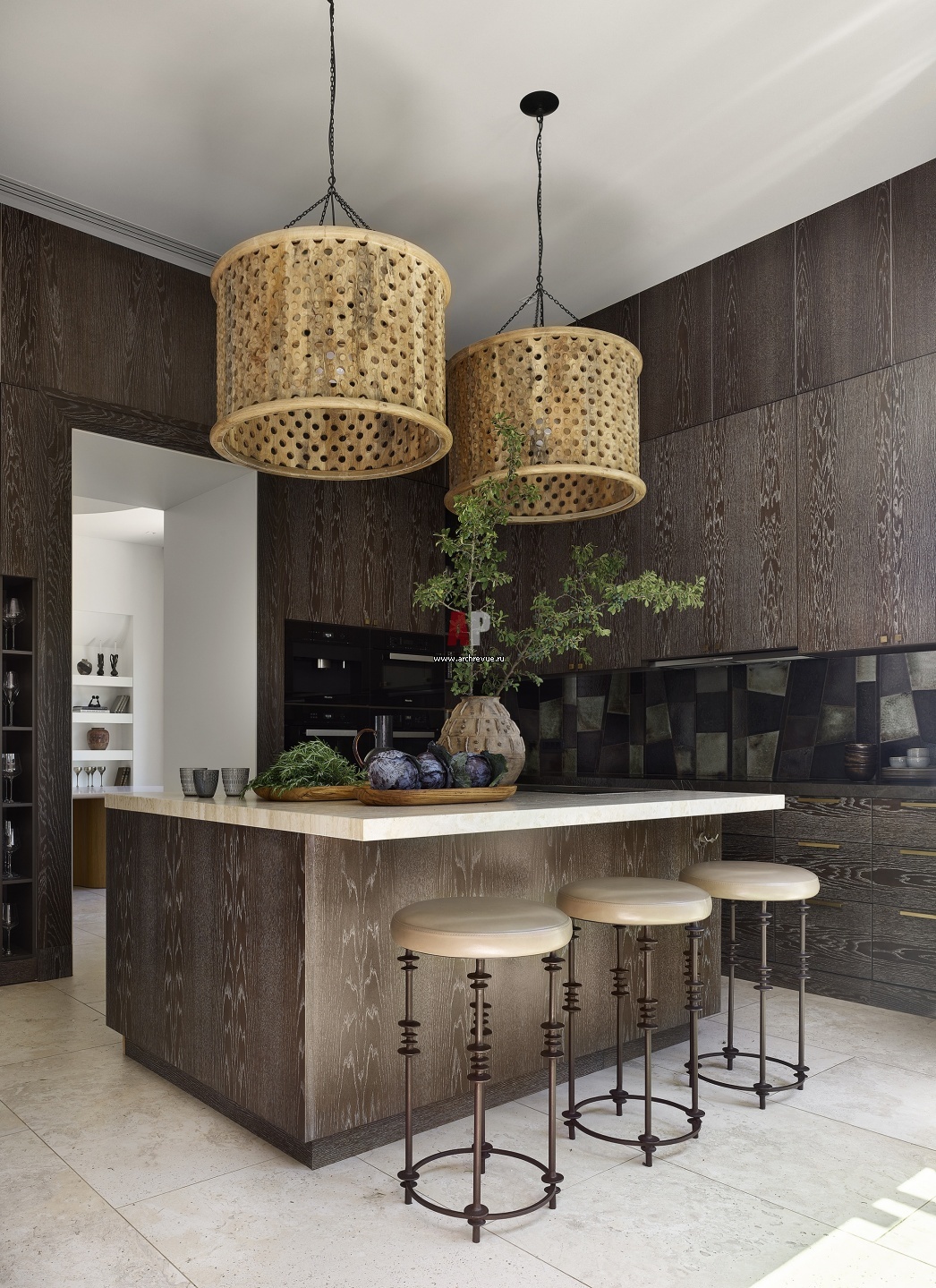 Кухонный гарнитур с островом, шпон дуба, прошедший четыре этапа тонирования и с четырьмя слоями патины, заказ – изготовление Bionica Wood. Подвесные светильники из дерева, Arteriors.