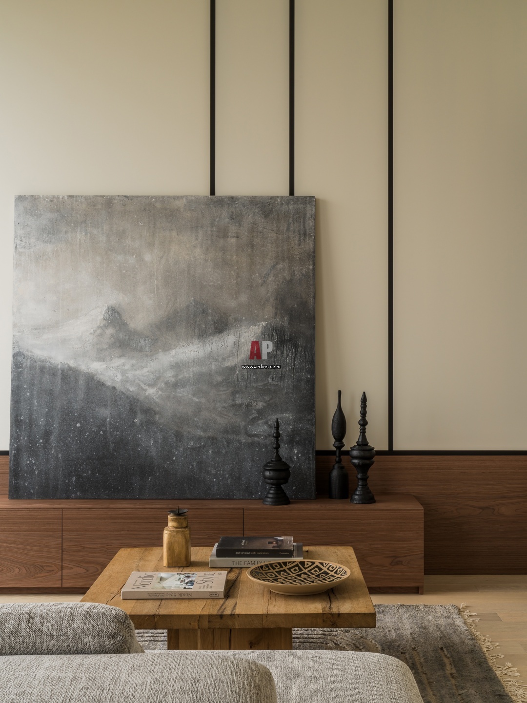 В оформлении дизайнеры применяли шпонированый МДФ и МДФ в цвет стен с геометричным ритмом в виде черных элементов.