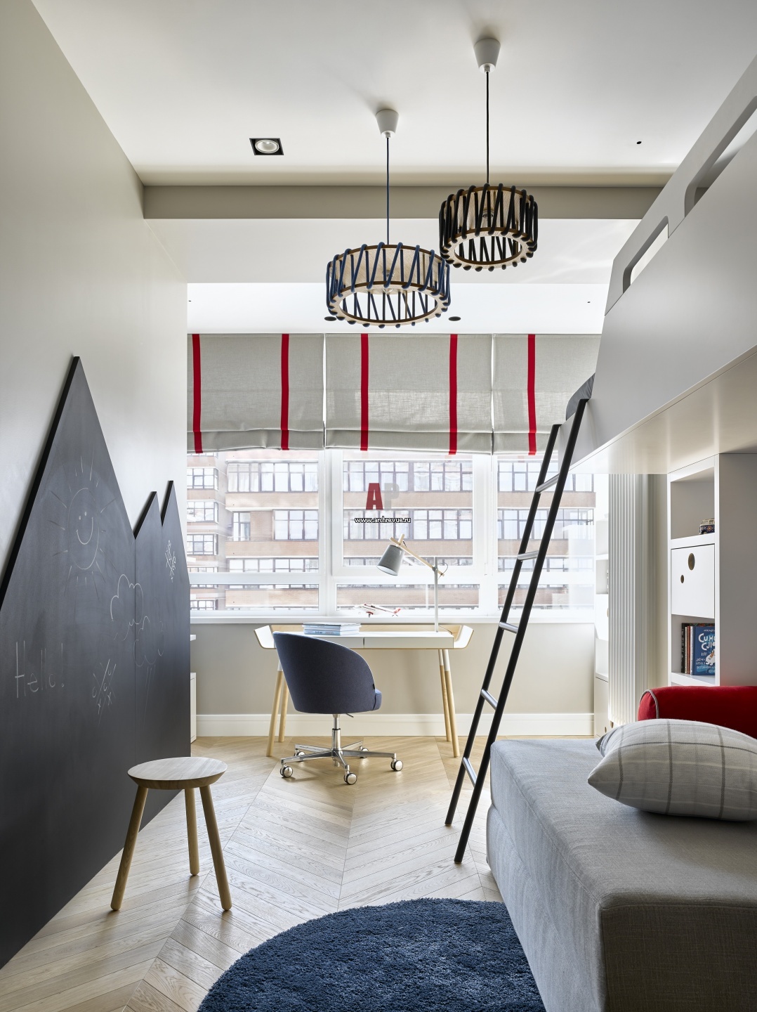 Детская сына разделена на несколько зон. Рабочий стол расположен на присоединенной лоджии, увеличение помещение за счет лоджии позволило улучшить освещенность пространства.