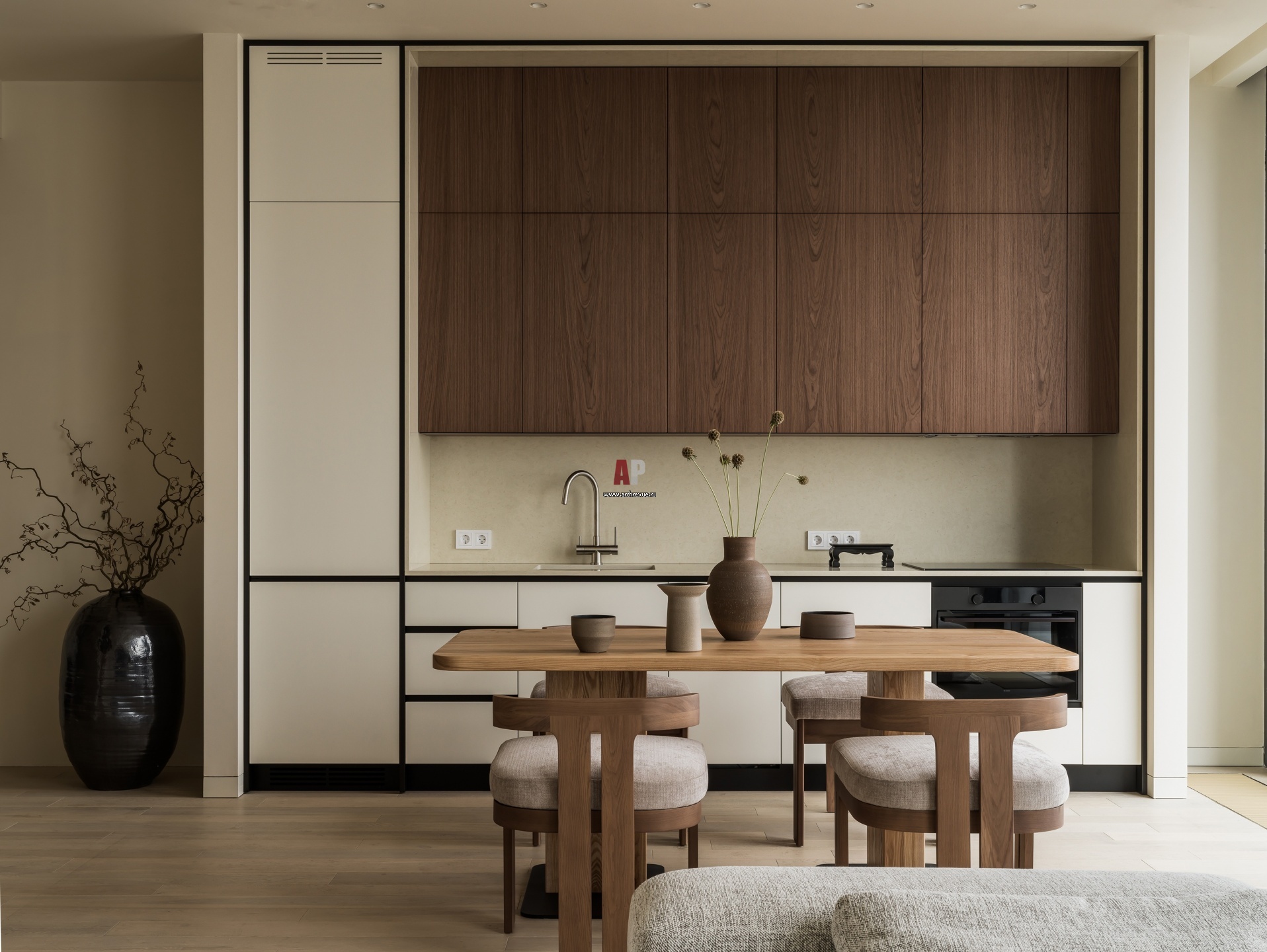 Современная квартира с эстетикой ваби-саби. Интерьер кухни. Шпонированные фасады дополняют монохромный сдержанный интерьер.