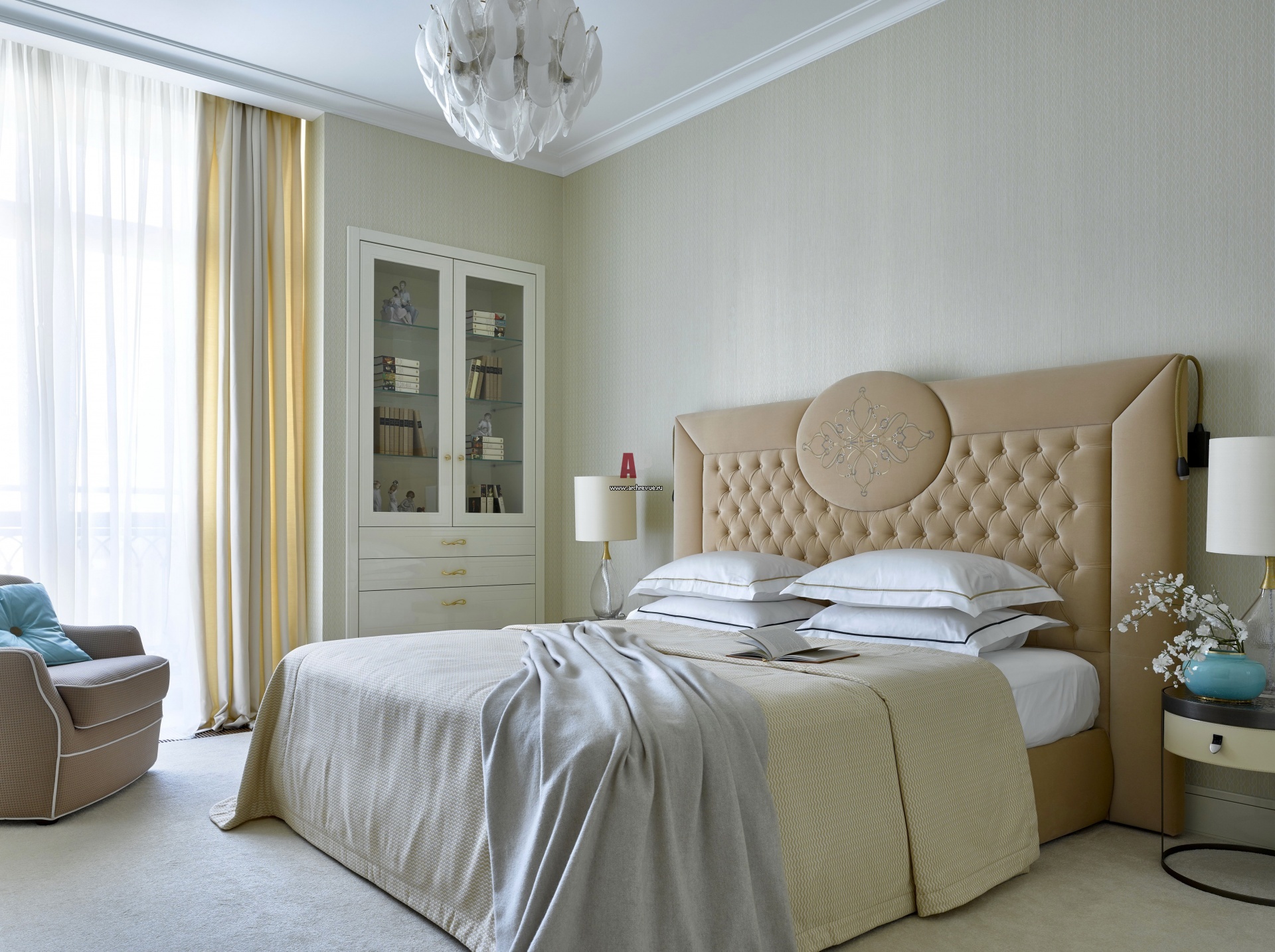 Светлая квартира с представительским декором. Интерьер хозяйской спальни. Кровать, Fendi. Прикроватные тумбочки, Longhi. Встроенный шкаф, белая полированная эмаль, на заказ. Люстра, La Murrina.