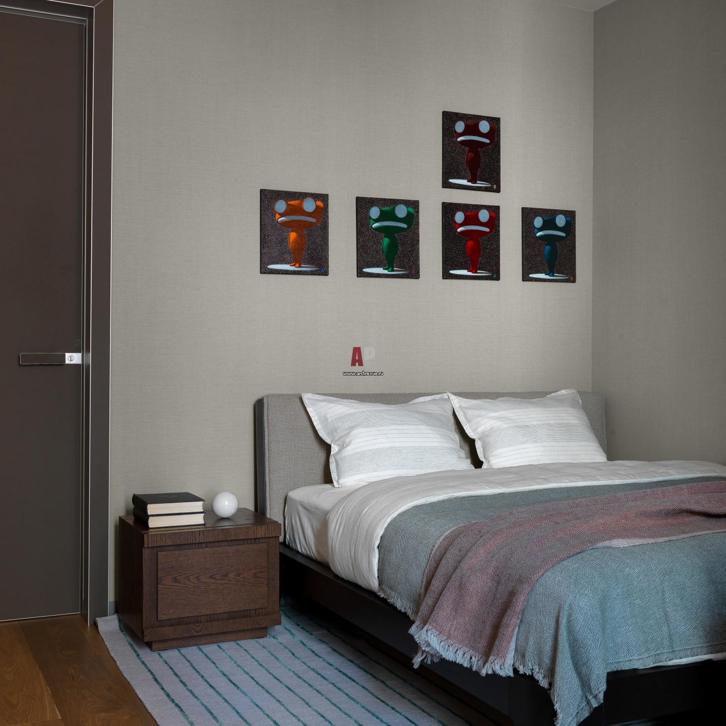 Гостевая спальня в трюфельных тонах. Текстильные обои, Omexco. Кровать, Meridiani. Прикроватная тумбочка, Mobilidea. Ковер, Jerome Botanic.