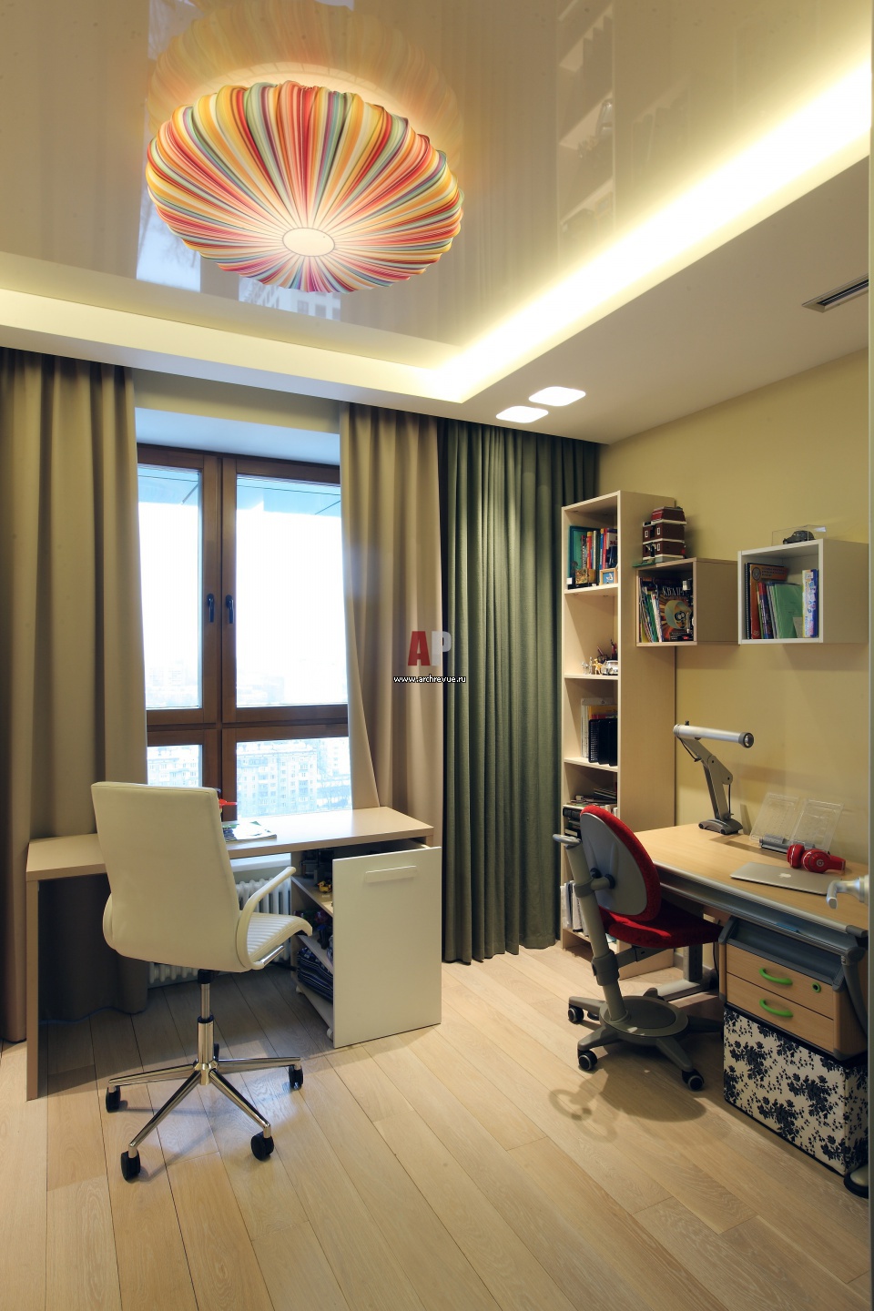 На фото – дизайн интерьера детской комнаты с двумя рабочими столами. Потолочный светильник из разноцветной ткани.