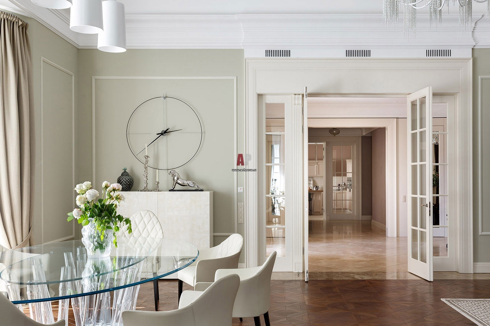 Столовая группа выглядит легко и изящно. Стол из прозрачного стекла и белые стулья, Reflex.
