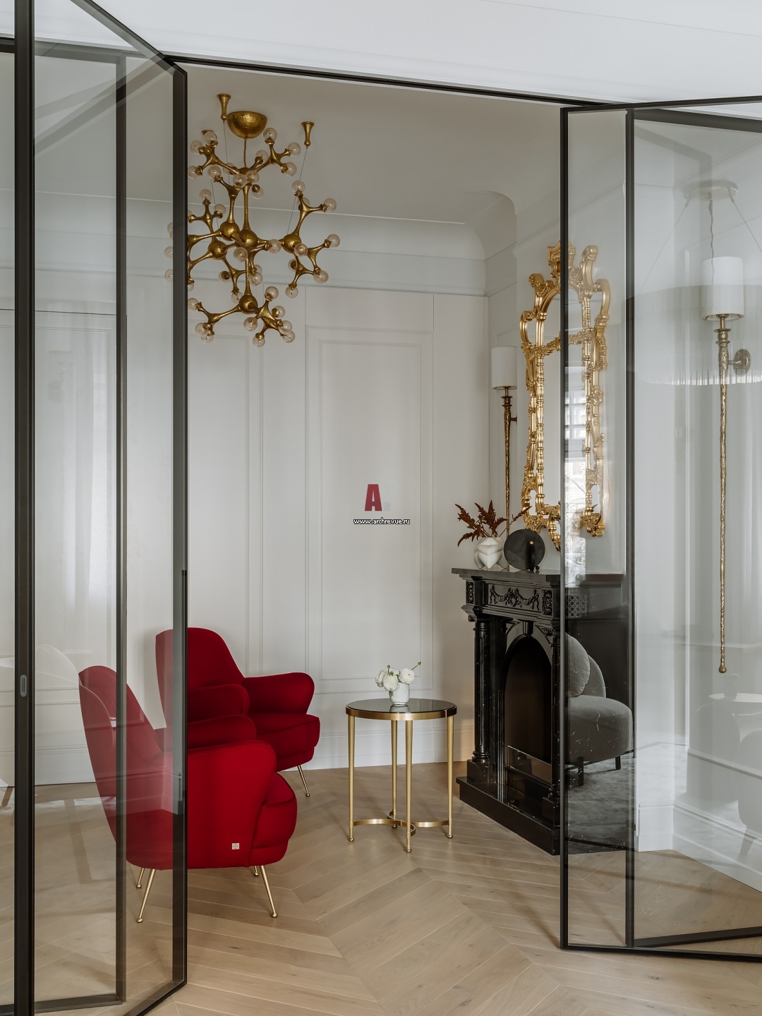 Удачным решением стала организация уединенной каминной зоны при входе в квартиру. Она отделена от общей зоны кухни-гостиной стеклянными перегородками, а от спальной зоны – декоративными классическими панелями.