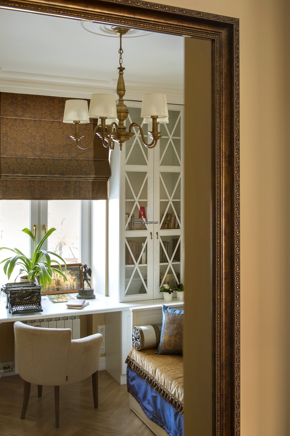 Фото интерьера одной з спален. Письменный стол объединен с подоконником. Белые шкафы сделаны на заказ.