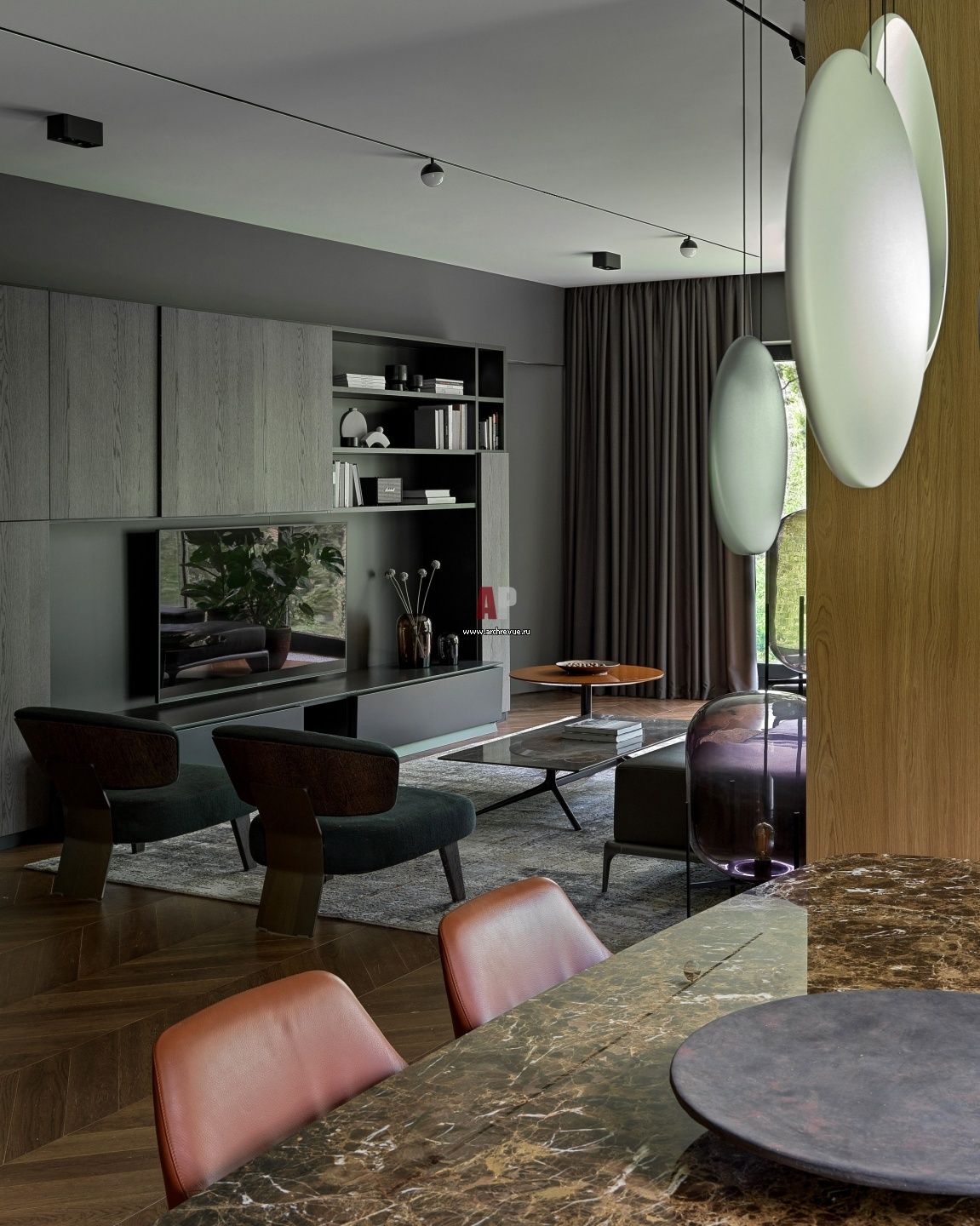 Вид на гостиную. Стена, скрывающая несущую колонну, обшита деревянными рейками.