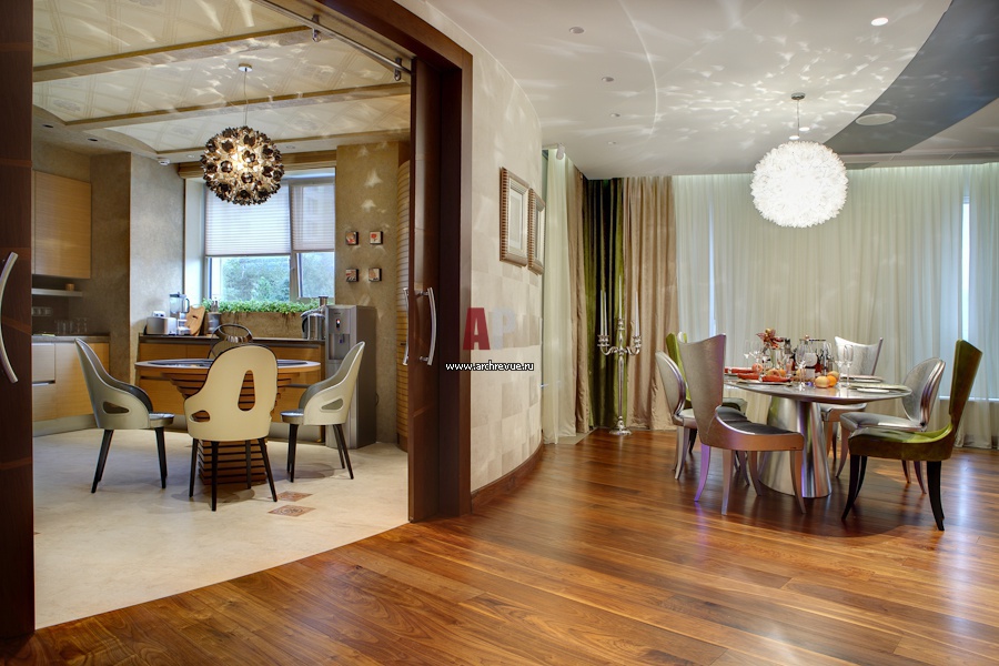 Общественная зона гостиной представляет собой открытое пространство с перетекающими друг в друга помещениями. Кухню зонируют раздвижные полукруглые двери, выполненные на заказ из мультишпона ореха, изготовление компания «БКС».