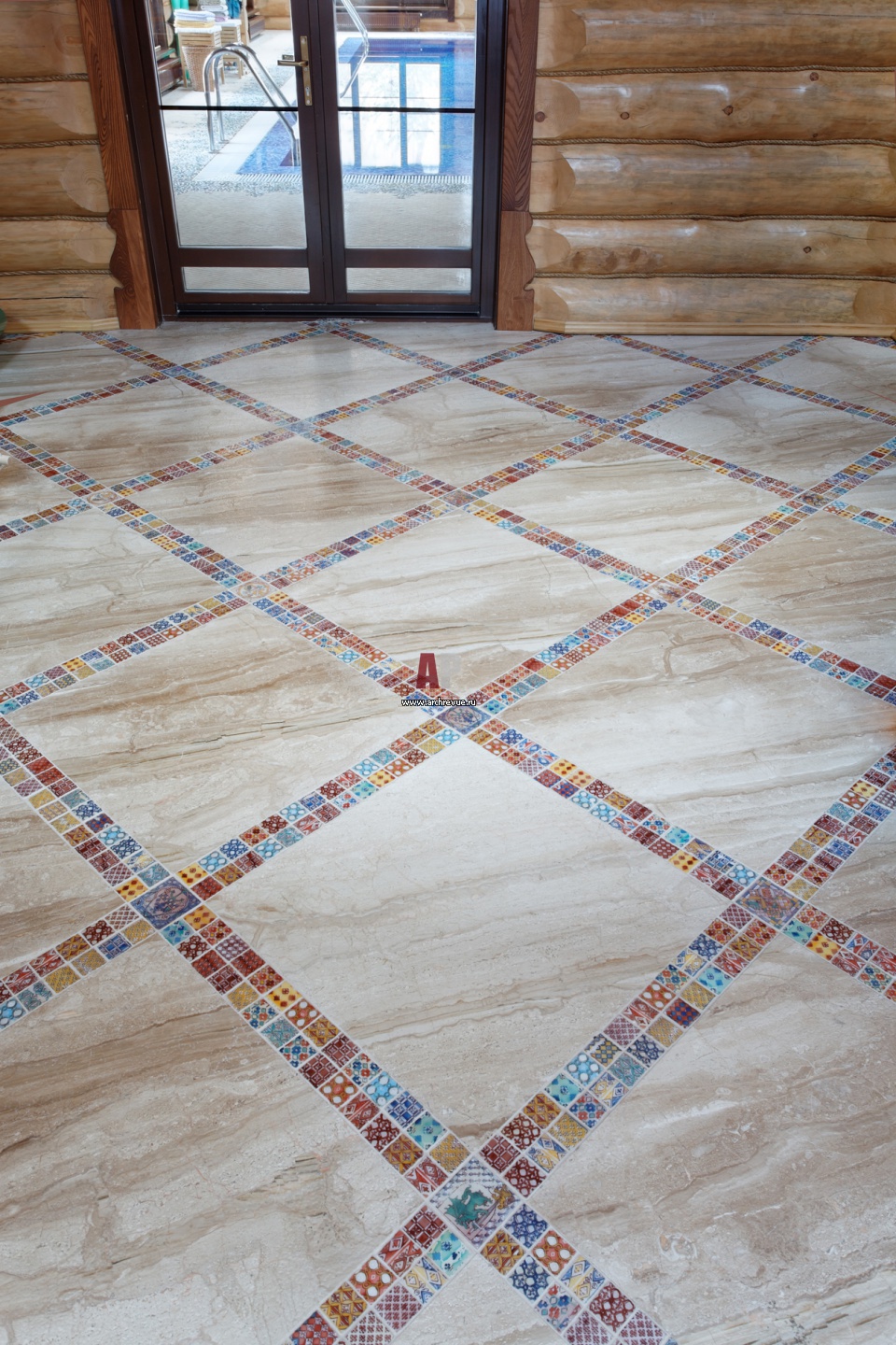 Фрагмент оформления пола. Между плитами мрамора – мозаика из уральских самоцветов. Мрамор «Дайна», поставщик Estro.