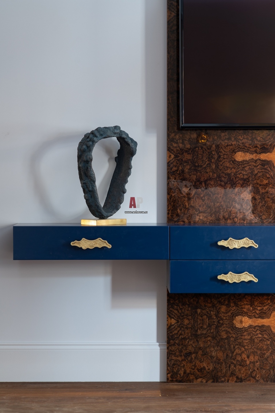 Напротив кровати – консоль с латунными ручками, изготовленная на заказ по эскизам авторов проекта. За ней – панно из корня ореха. Скульптура работы Ирины Россоловской.