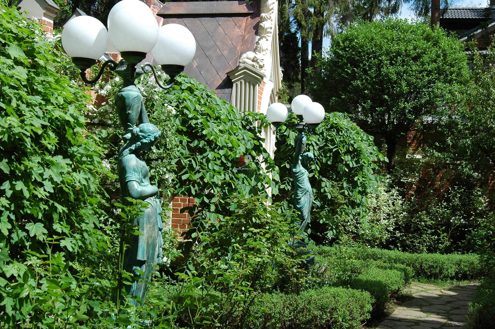 Прекрасным фоном для бронзовых фонарей-скульптур служат кроны плакучих вязов, крупная листва которых имеет темно-зеленый благородный цвет. Они сообщают композиции поэтичное настроение.