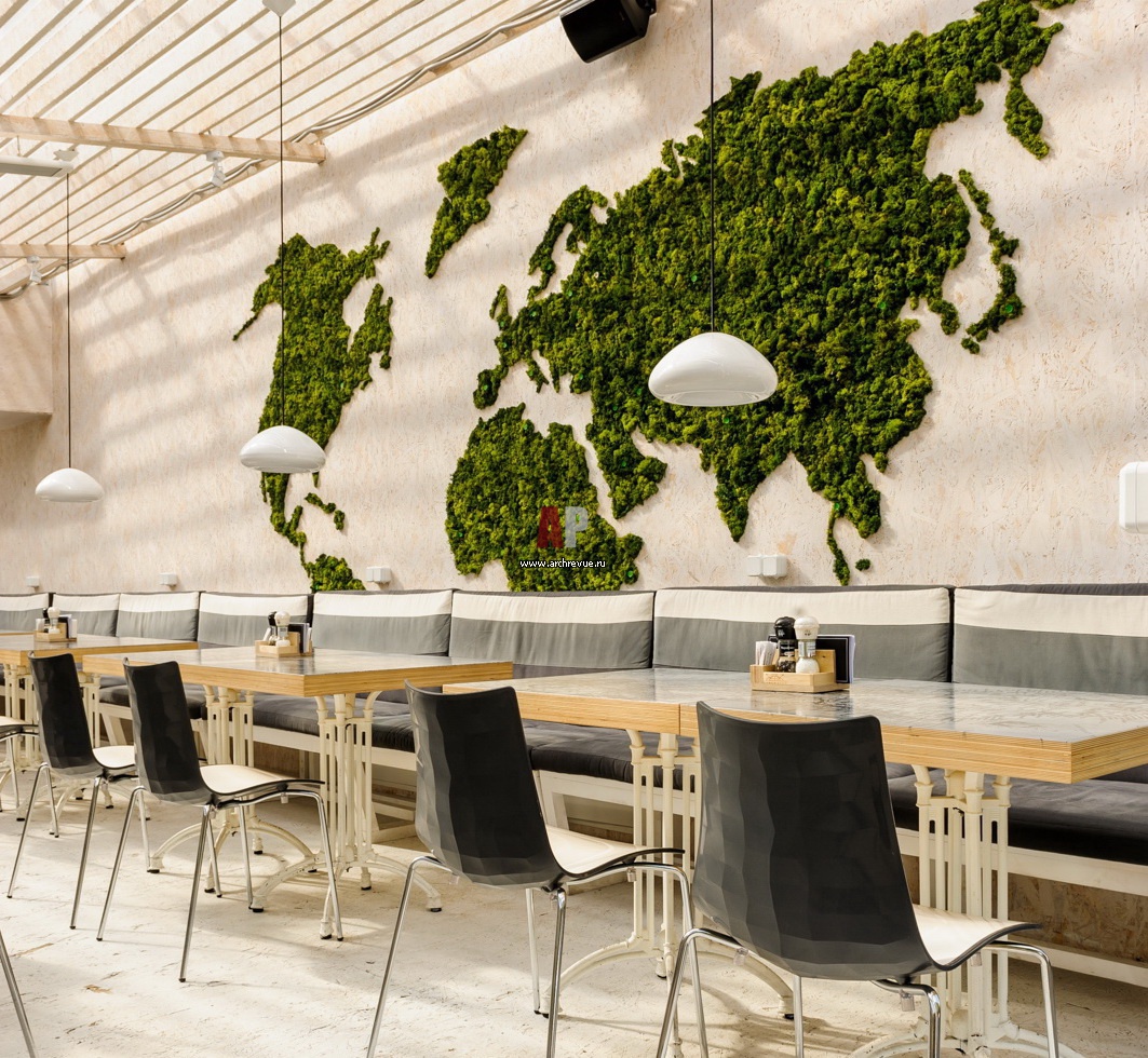 Проект интерьера летней веранды. Стена зашита некрашеными OSB-плитами. На ней созданы композиции из природного мха, которые складываются в силуэты географических континентов.