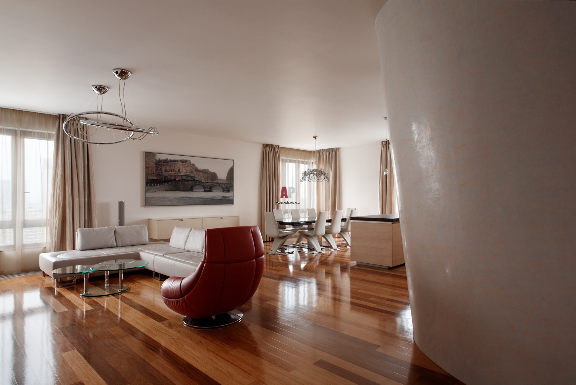 Вокруг внушительного скульптурного объема группируются жилые помещения. Кресло и диван De Sede. Столовая группа Draenert.