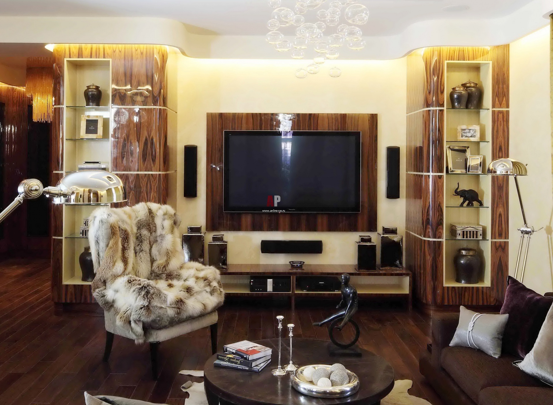 Зона ТВ в гостиной. Стены в интерьере общей зоны оформлены нейтральной декоративной штукатуркой с приятной шелковой фактурой.