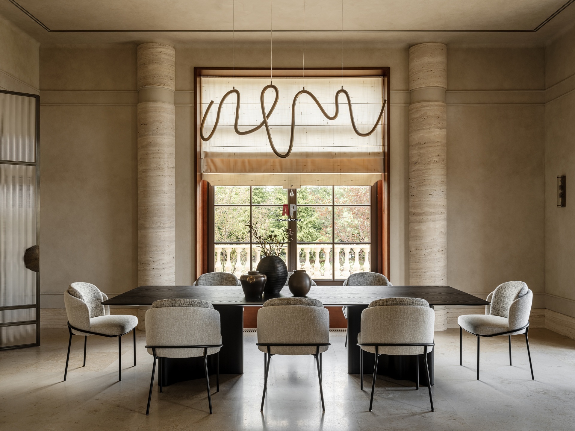 Парадная столовая. Обеденный стол, Minotti, модель Fil Noir «Dining». Обеденные стулья, Minotti, модель Marvin. Подвесной свет: индивидуальное изготовление, по авторским эскизам. Бра, винтаж.