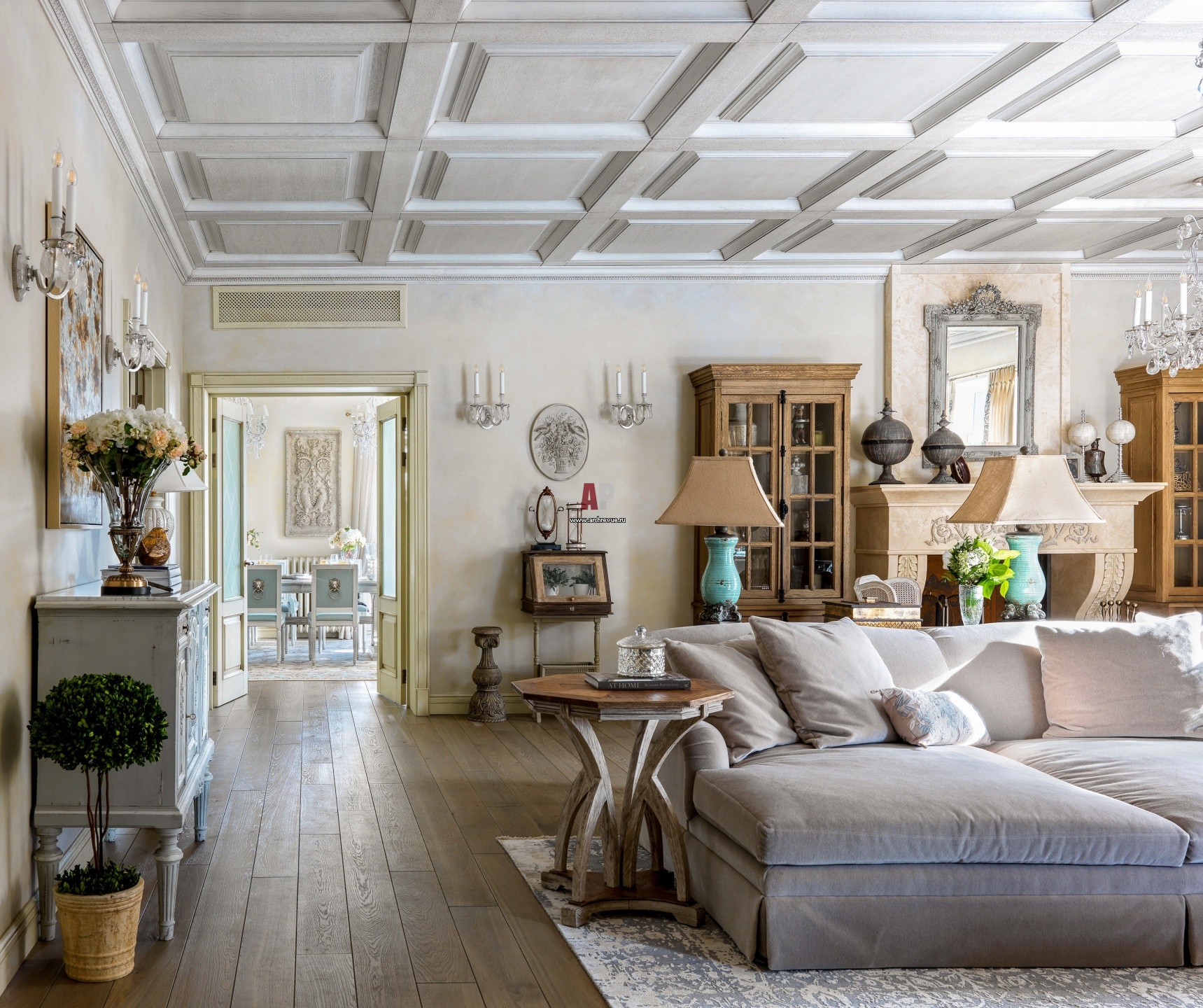 Кессонные потолки, гипсовые карнизы, деревянные двери и фасады оставшейся от прошлой жизни дома мебели авторы проекта перекрасили и облагородили, заменили фурнитуру, добавили антикварного шарма. Мебель, светильники, аксессуары привезены из США.