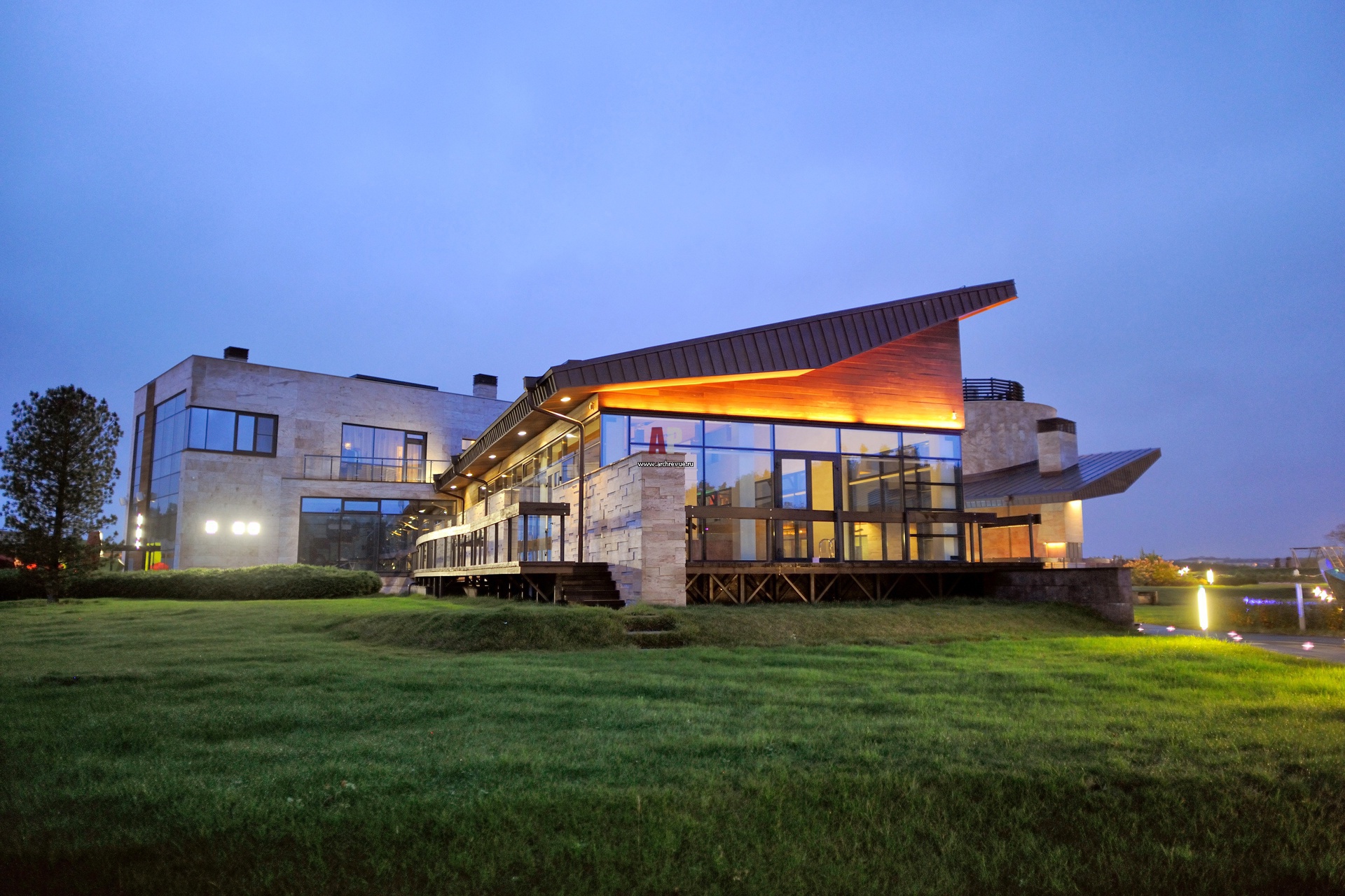 Фасад дома с панорамным остеклением. В торцевой части расположен бассейн и зона СПА.