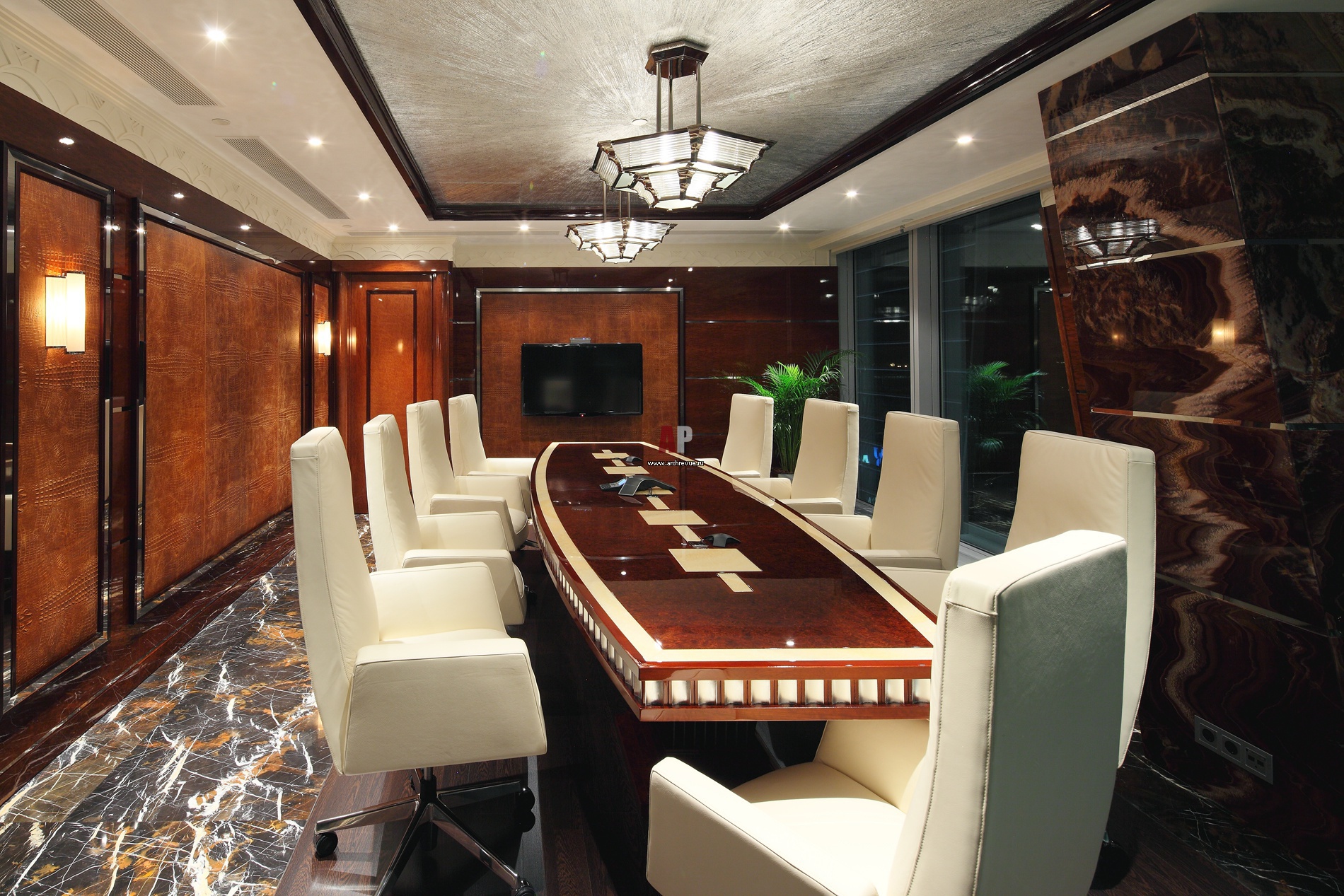 Стены переговорной зашиты панелями из кожи, изготовление «ДОФ». Колонна облицована слэбом красного оникса.