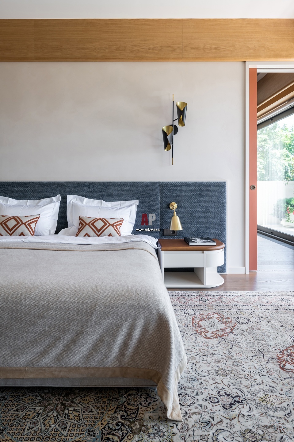 Главная спальня. Изголовье в ткани Zoffany. Бра, &Tradition и Atelier de Troupe.