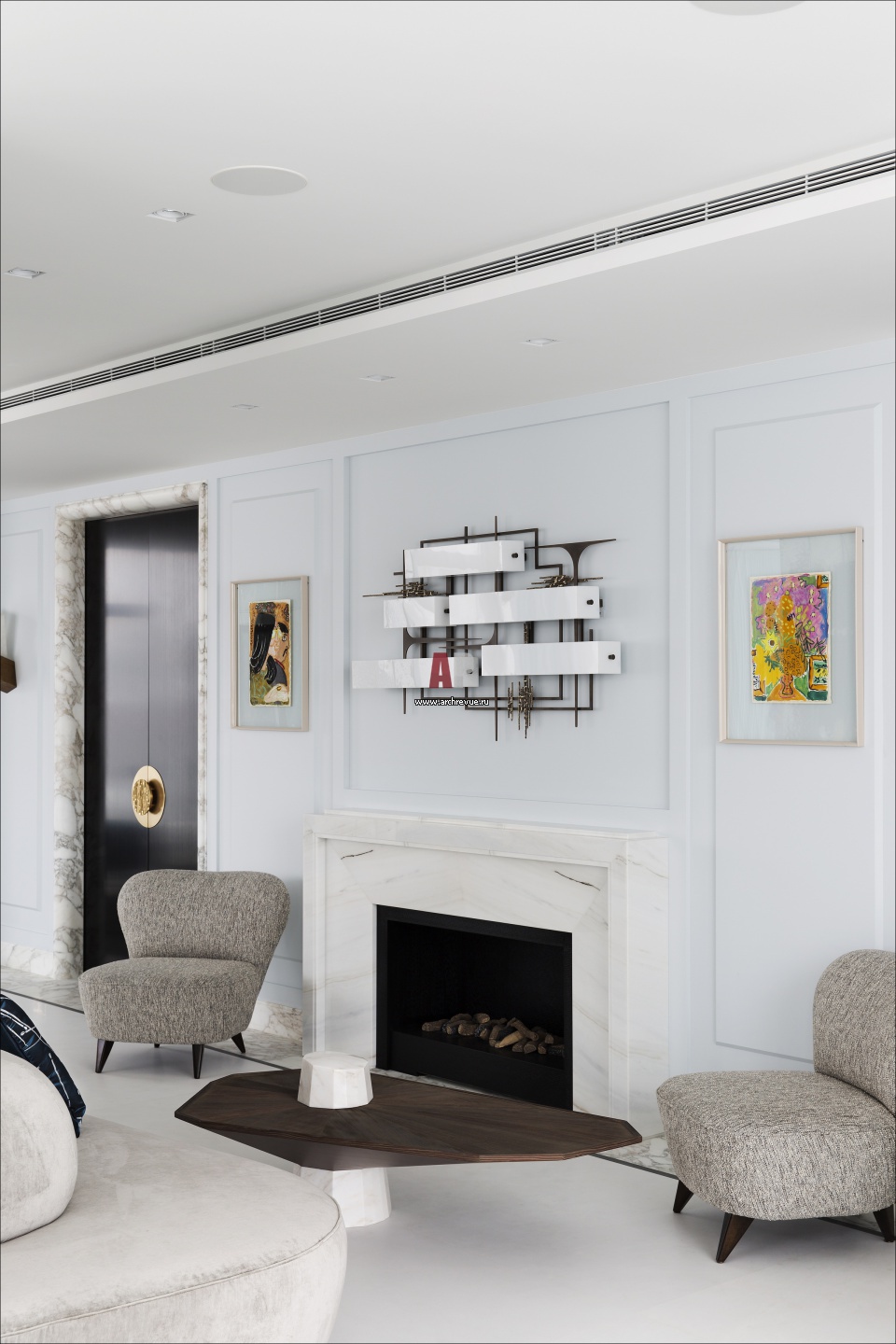Белоснежный камин в большой гостиной.