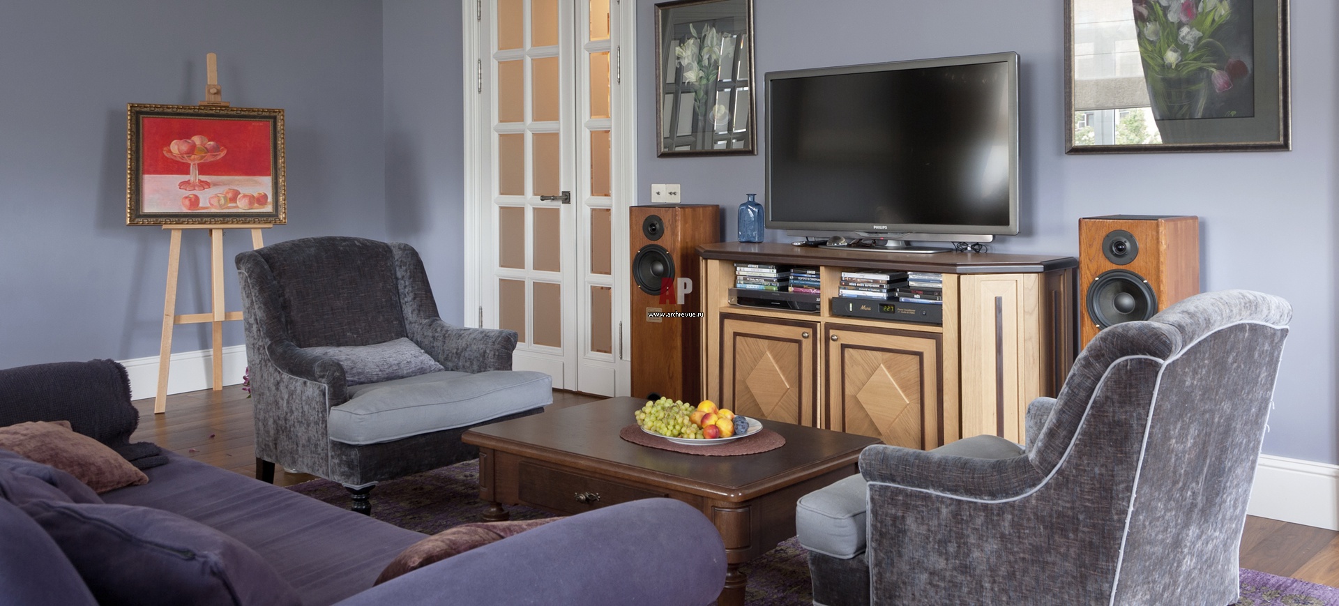 Интерьер диванной группы с ТВ. Тумба под ТВ сделана на заказ. Колонки акустические домашнего кинотеатра с корпусом из дерева.