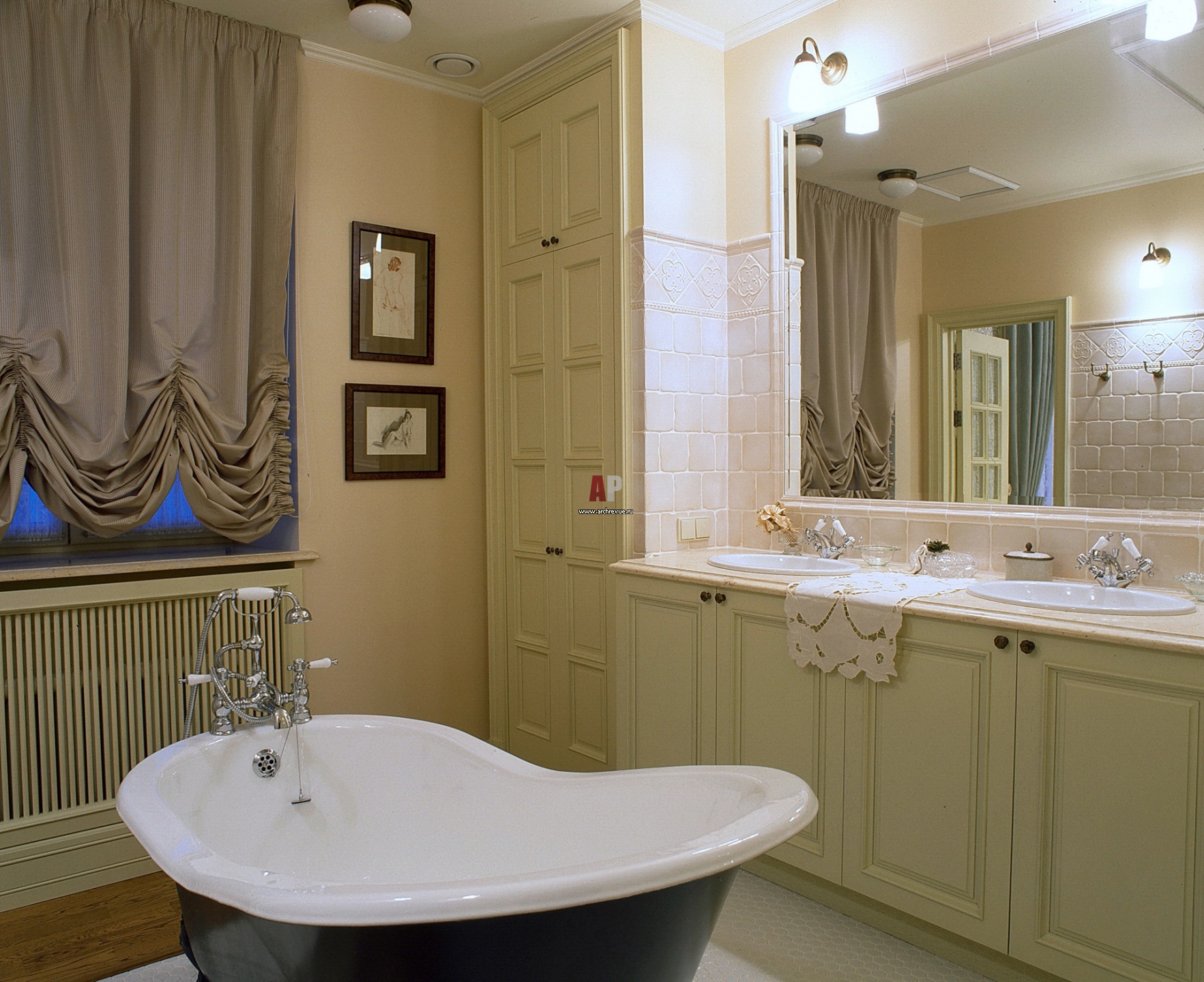 Ванная с окном. Шкафы и тумба под умывальник сделаны на заказ, по эскизам архитектора из дуба, выкрашенного в белый цвет. Работы по дереву, TermitStudio. На окна – римские шторы из натуральной ткани.