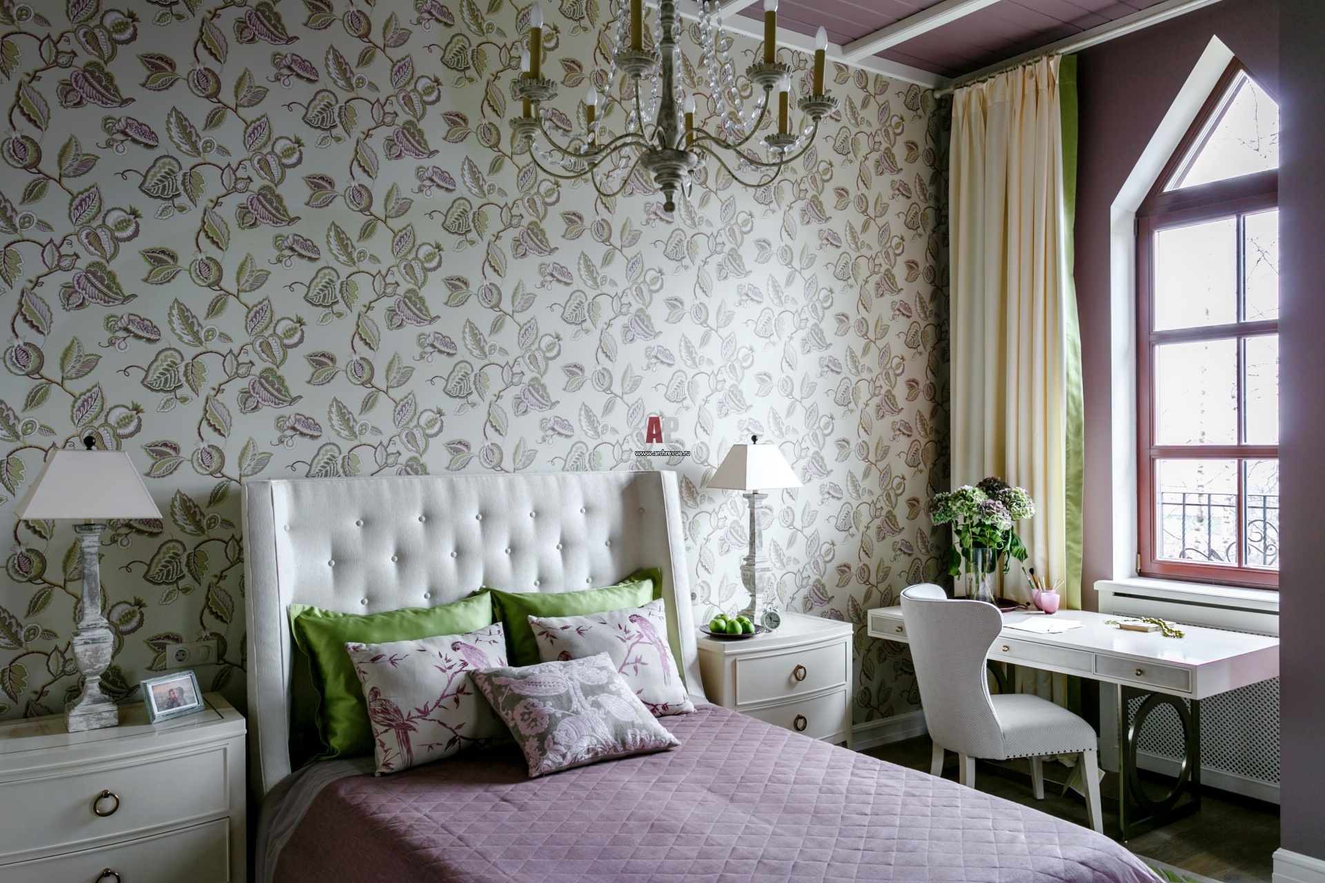 Детская спальня в мансарде с сиреневым деревянным потолком и цветочным декором. Обои, York Wallcoverings, коллекция Waverly Classics. Прикроватные тумбочки, кровать, стул и письменный стол, Bernhardt. Свет, Visual Comfort & Co.