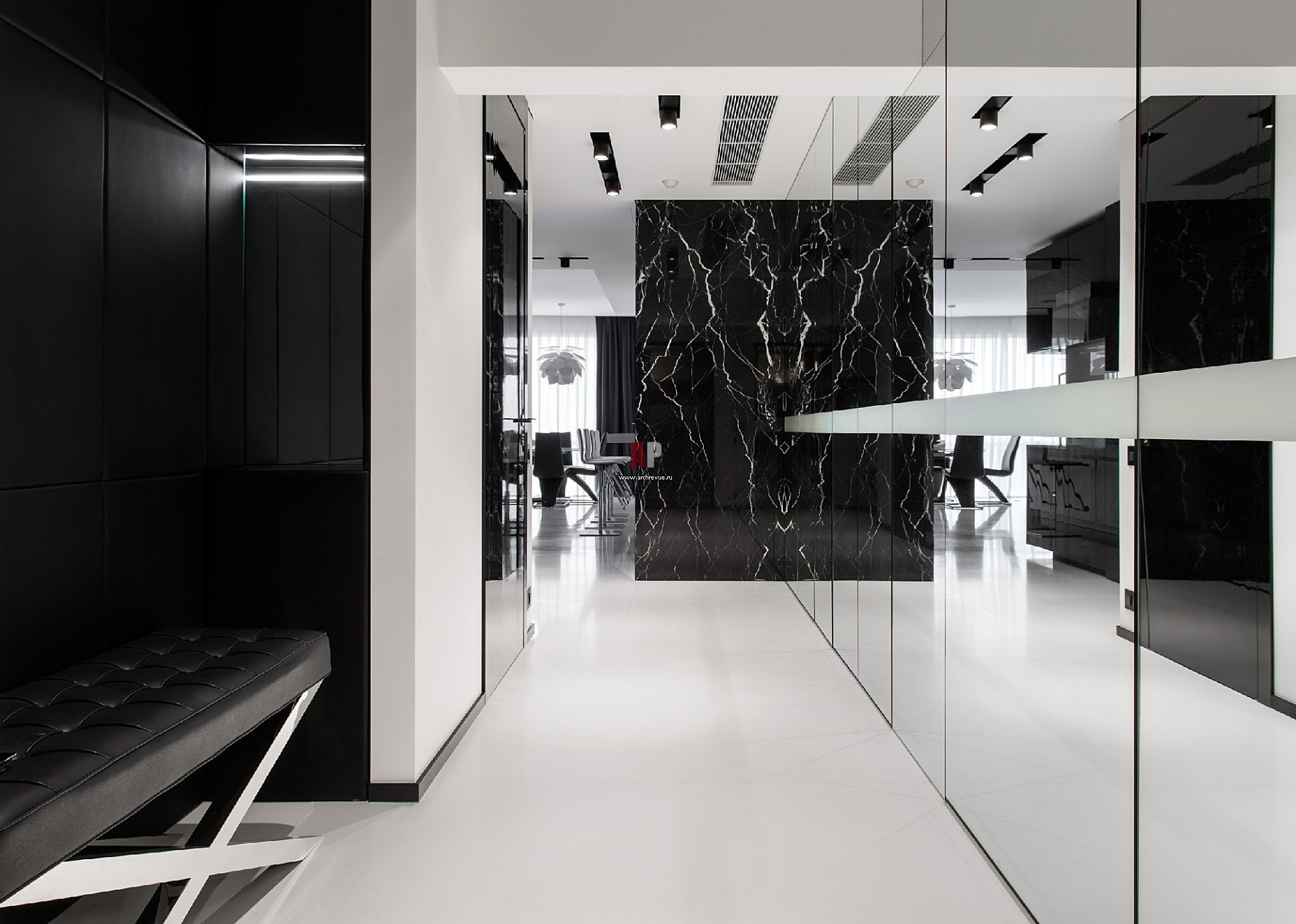 Прихожая и гостиная визуально объединены. За зеркальной стеной располагается гардеробная. Отделяющий входной блок от кухни простенок облицован черным камнем живописной фактурой.