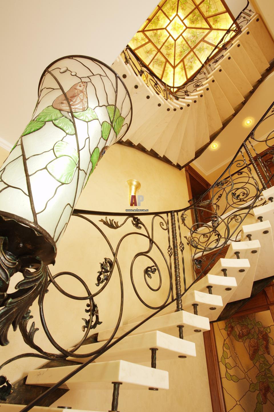 Лестница – одна из главных осей в пространстве этого дома. Невесомая, прозрачная, оплетенная тончайшим кованым ограждением, она связала все интерьерные решения этого дома.