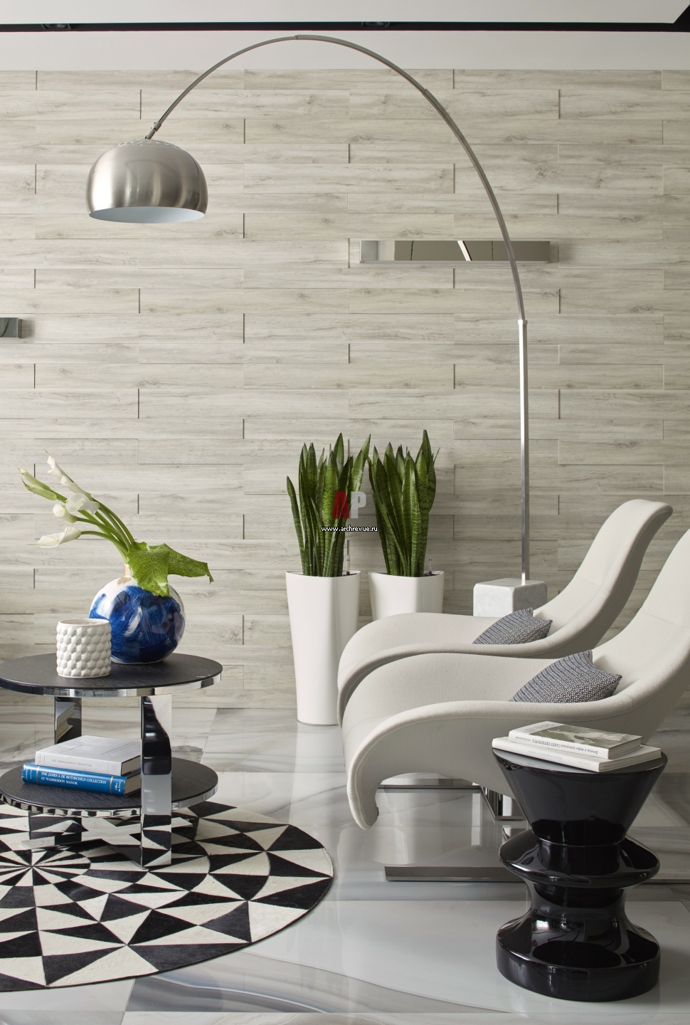 Стена в зоне отдыха облицована 3D-панелями Meister с фактурой дерева. Кресла, столик, B&B Italia. Табурет, MHLiving.