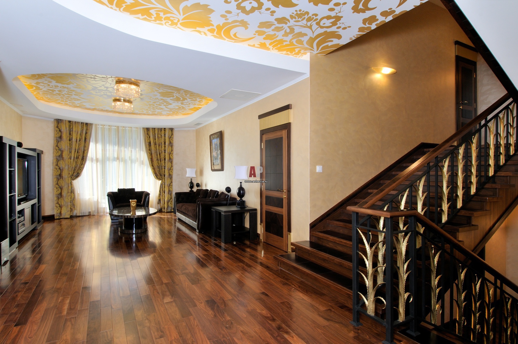 Спальный блок из нескольких спален расположился на втором уровне. Он объединен общим холлом с золотой росписью на потолке, выполненной трафаретным способом.
