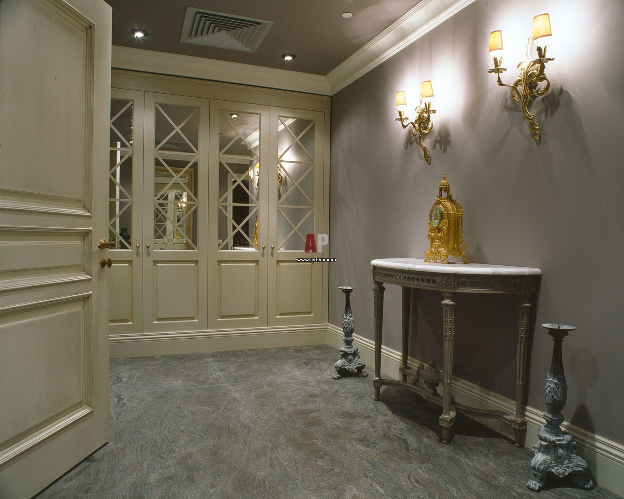 Шкаф в прихожей выполнен по эскизам Елены Кангиной. На полу – слэбы из индийского гранита сорта Paradiso spazzolato с синими прожилками.