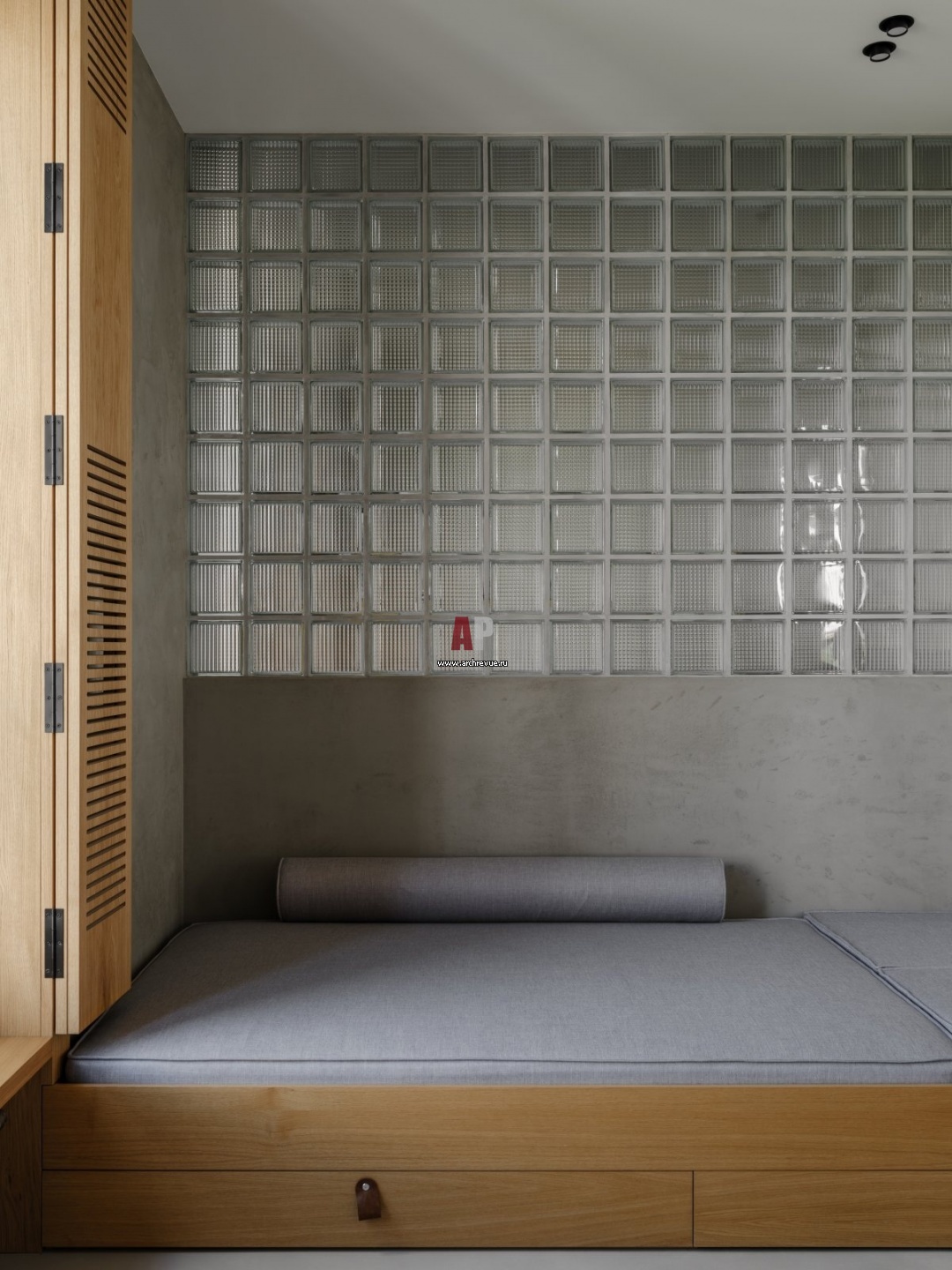 Кабинет. Вместо привычного дивана – татами в японском стиле. Стена оформлена стеклоблоками.