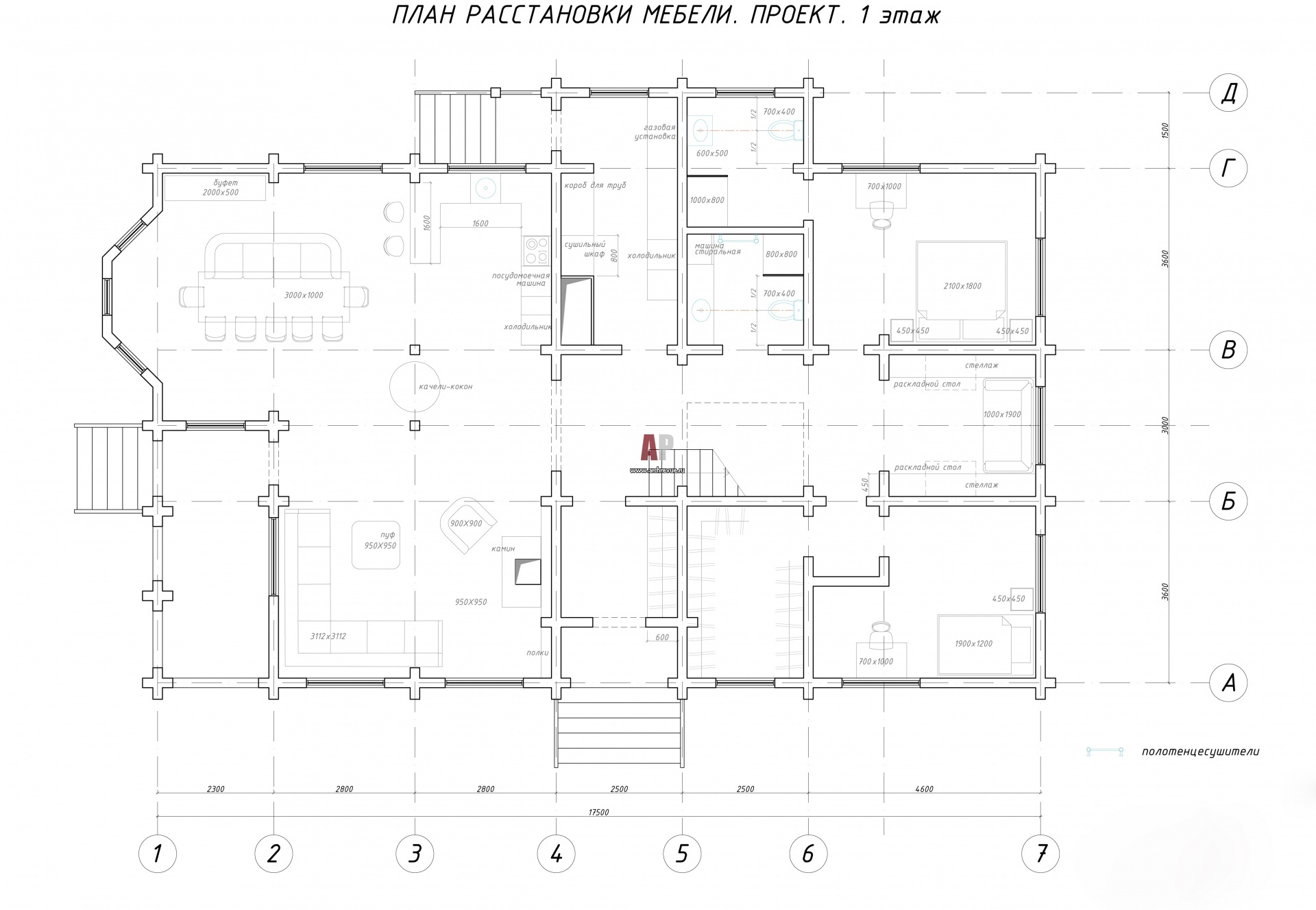 Планировка 1-го этажа 2-х этажного деревянного коттеджа для большой семьи.