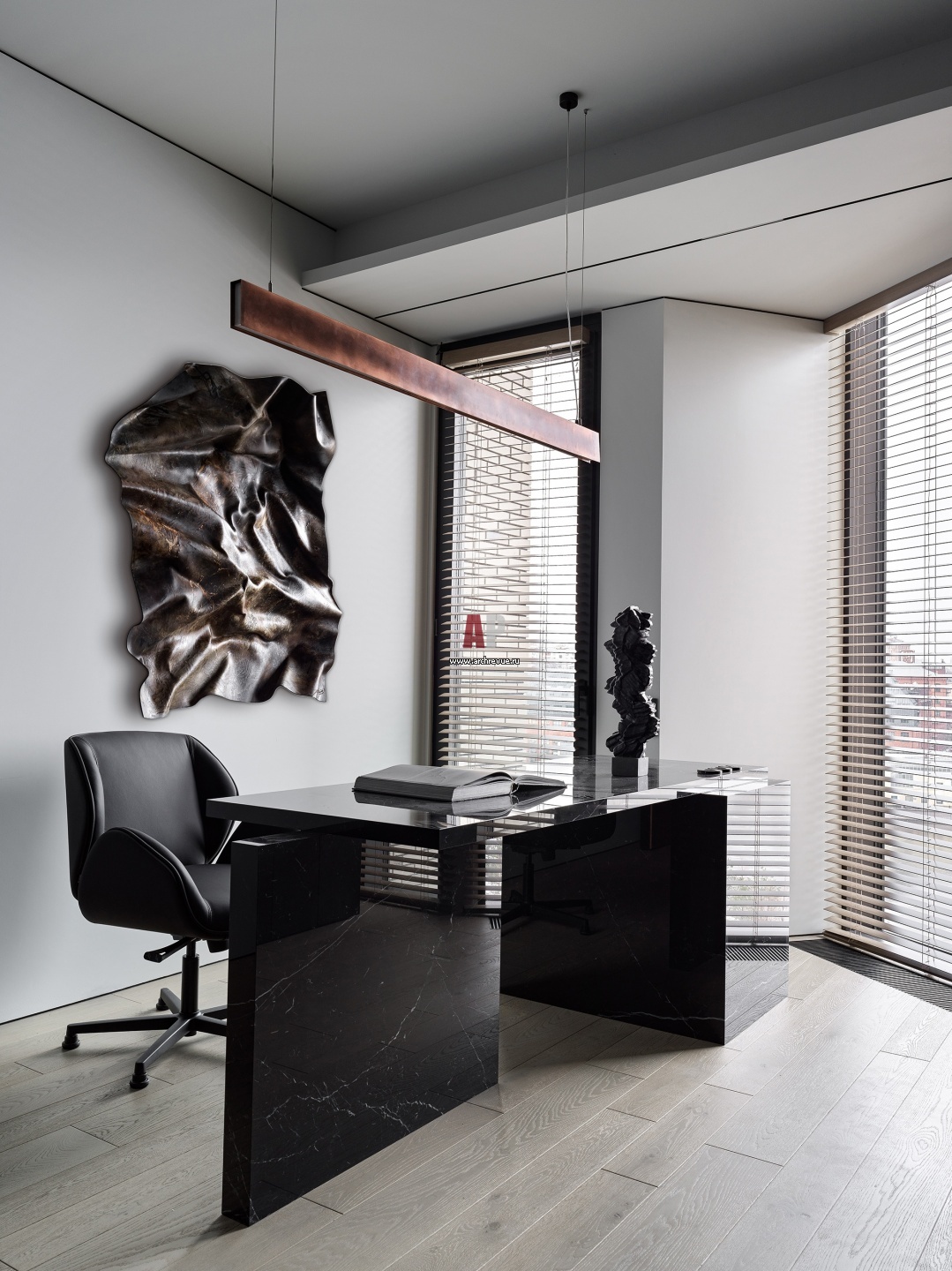 Кабинет. Письменный стол, индивидуальный дизайн и изготовление под проект. Стул, Vaghi, Suoni. Скульптура на столе работы Льва Ефимова. Арт-объект на стене Дениса Питанова.