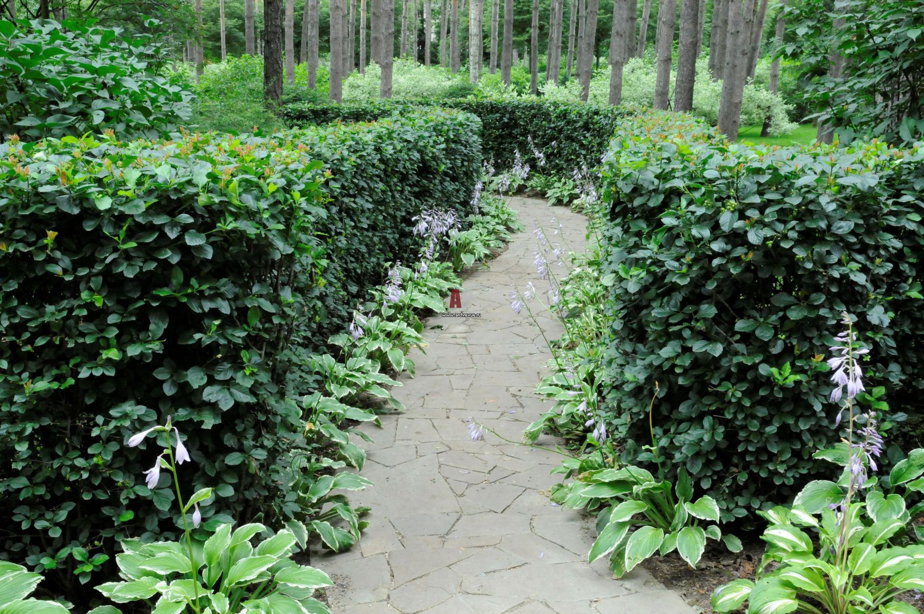 Все основные дорожки отделаны гранитом, чтобы покрытие было идеально ровным и вечным, в лесной зоне тропинки выполнены из песчаника, а огород отсыпан озерной галькой.