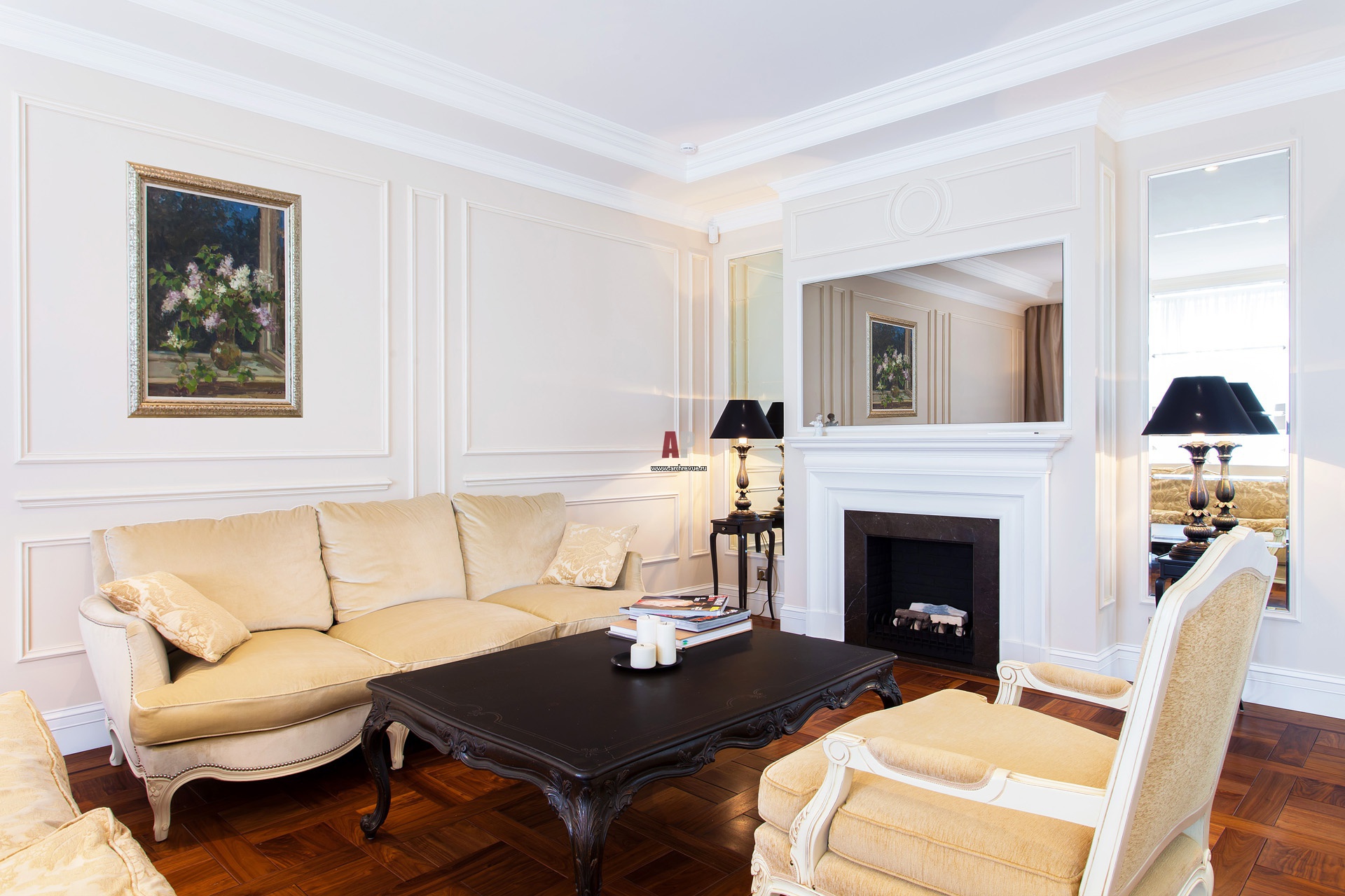 Дизайн диванной группы в классической по духу квартире. Дымоход камина оформлен плазменной панелью-зеркалом от Ad Notam.