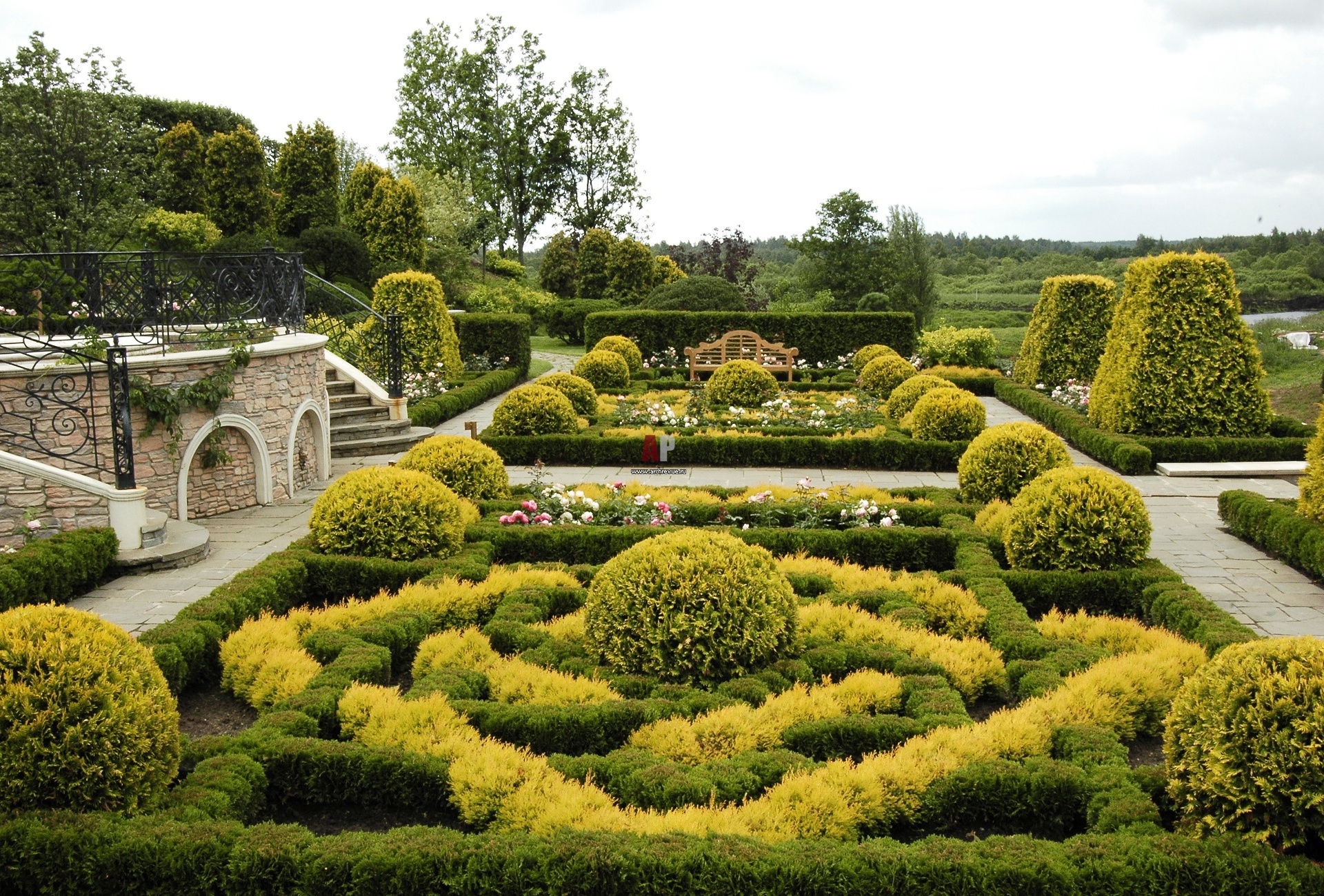 В центре участка построен маленький замок в англо-нормандском стиле. Благодаря холмистому ландшафту он возвышается над садом, огибаемый сложной системой многоярусных террас, каждая из которых имеет свой рисунок и предназначение.