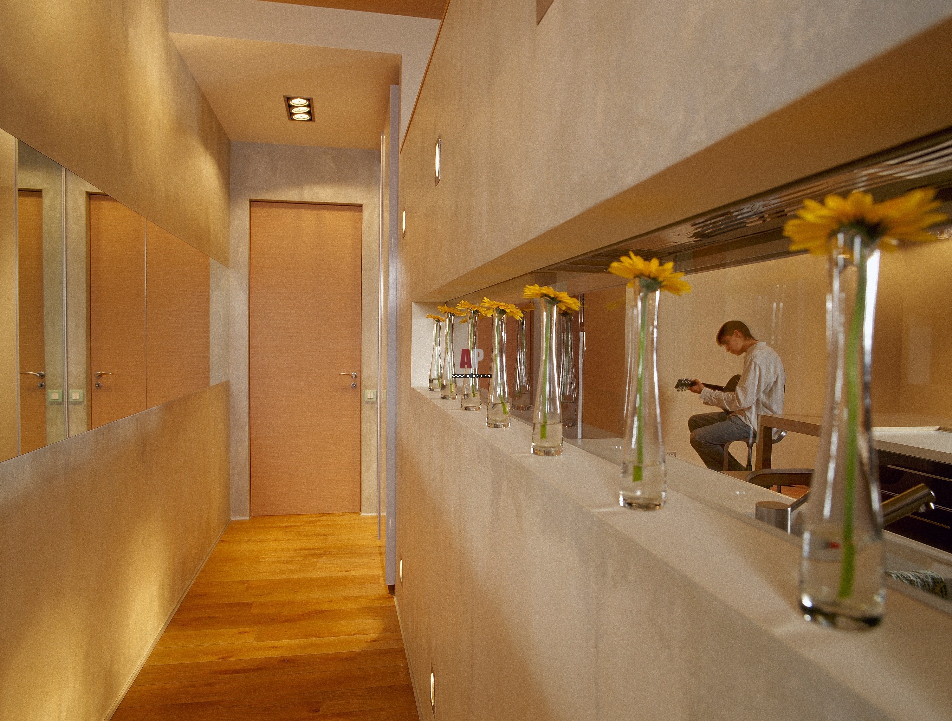 Через стеклянное окно в стене видна гостиная-кухня. Стены отделаны декоративными штукатурками с эффектом струящейся воды.