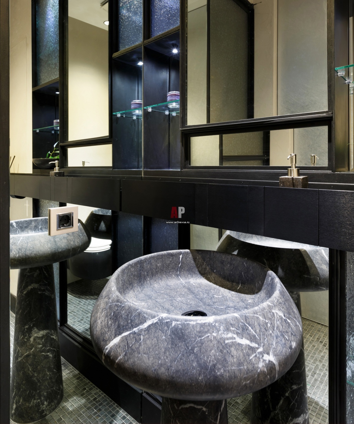 Интерьер гостевого санузла. Мраморная раковина на каменном постаменте отражается в зеркалах. Смесители, Agape.