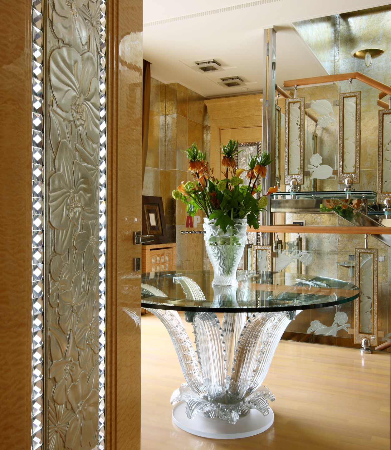 Фото входной зоны. Все двери в доме выполнены в едином ключе. Их центральную часть занимает панно с изображением цветов, вручную вырезанных из дерева и покрытых лаком. Его по периметру обрамляет ряд прозрачных стекол с фацетом.