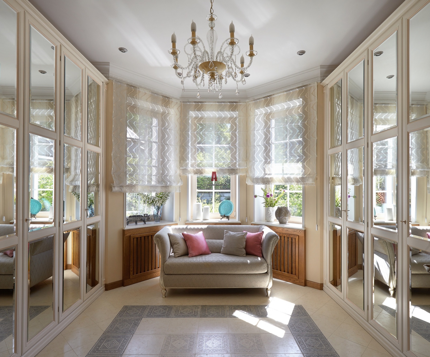 Гардеробная при входе занимает помещение с эркером. Классический настрой в ней создают античная мраморная плитка Petra Antiqua, зеркальные шкафы и хрустальная люстра.
