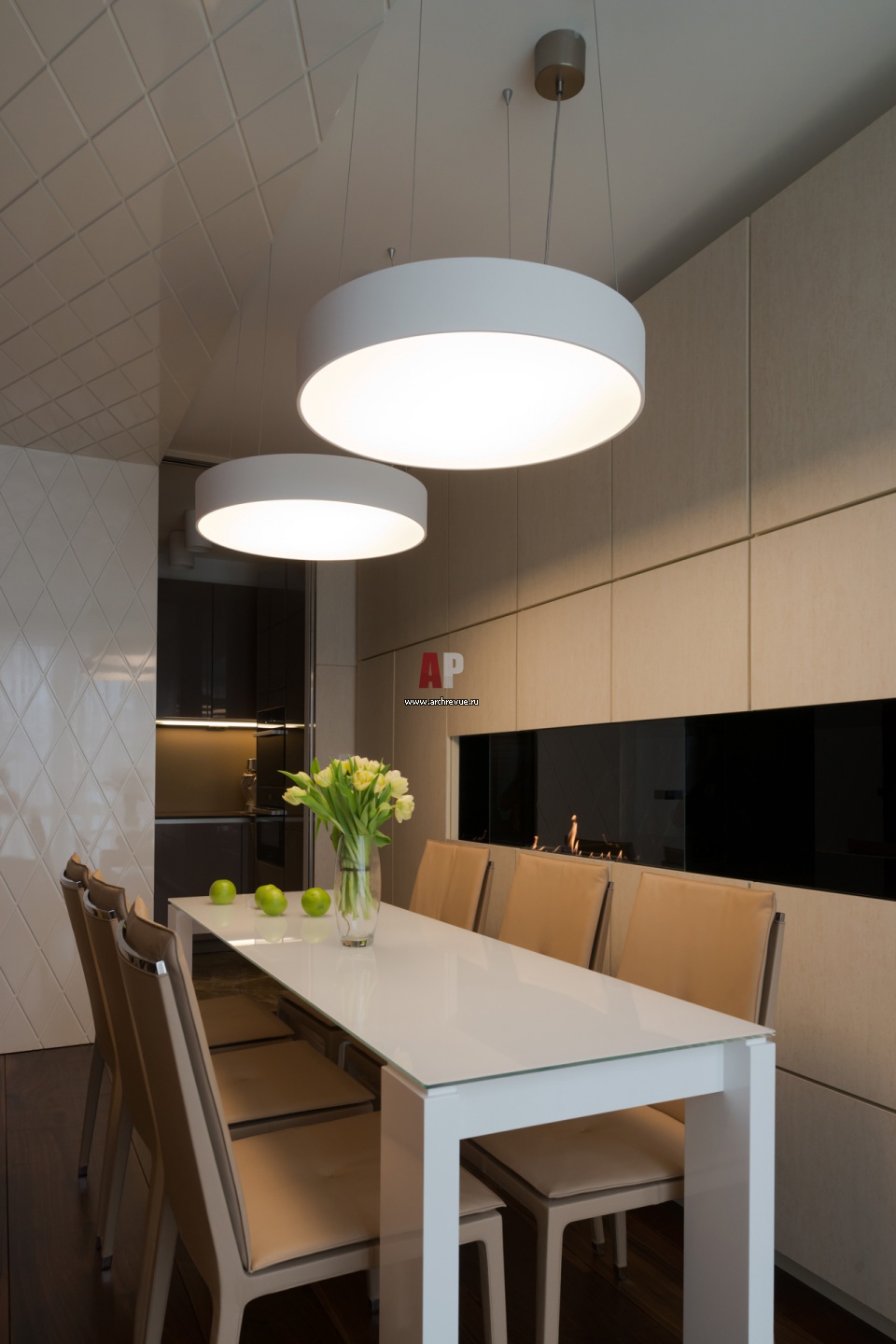 Столовая группа с камином в современной квартире. Шкаф с камином – технически сложное изделие. В нем спрятаны акустические колонки, датчик увлажнителя, биокамин, оборудование для домашнего кинотеатра, винный стеллаж.