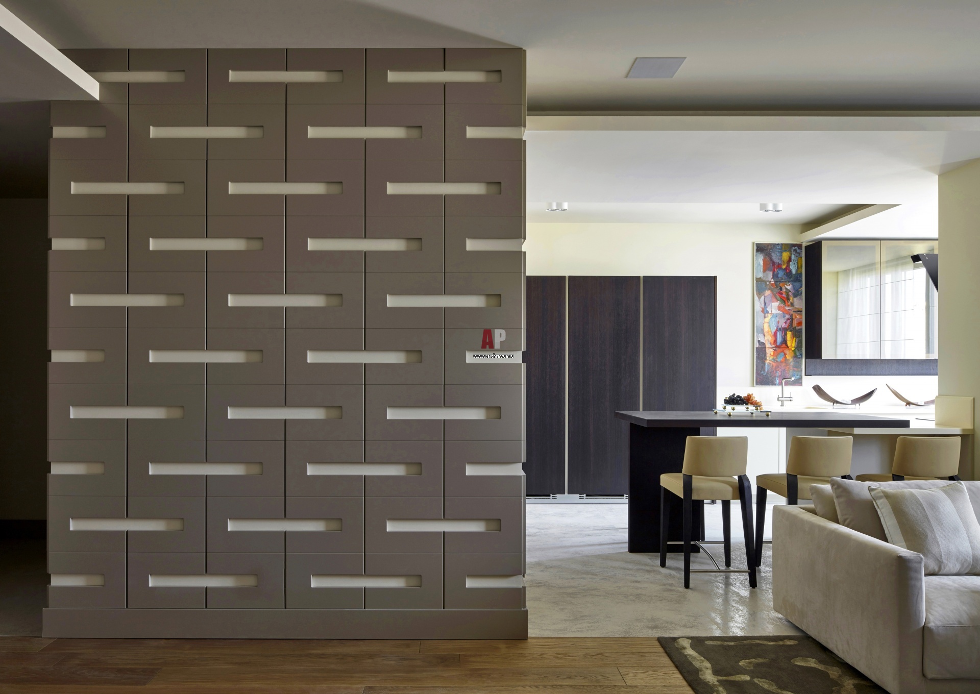 Стена, за которой расположен гостевой санузел, оформлена стеновые S-образными деревянными панелями с декоративными прорезями. Пол, тонированный дуб, поставщик «Мир Паркета».