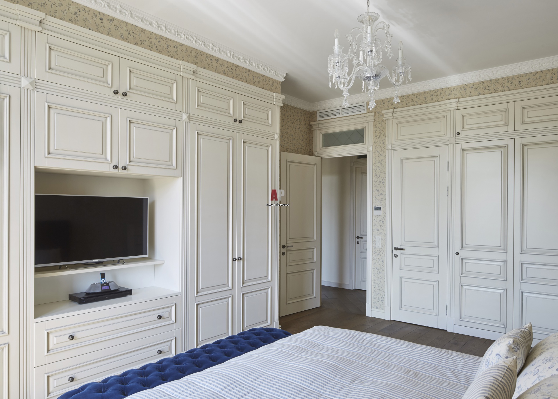 Интерьер спальни. Встроенные шкафы выстроены вдоль двух стен, их глубина 60 см. Дверь в ванную комнату встроена в общую композицию. Белая эмаль по МДФ с патиной, изготовление «Бесст».