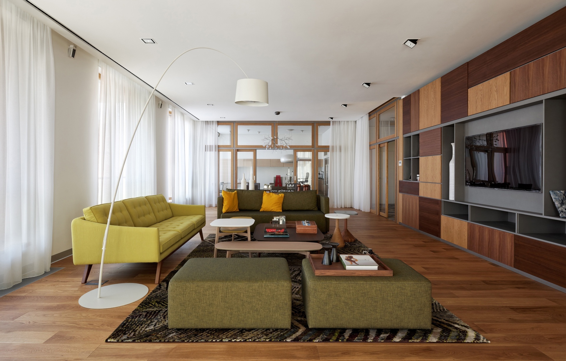Интерьер гостиной выполнен в стиле 1970-х годов, он меблирован ностальгическими репликами тех времен. Журнальные столки, Calligaris, Miniforms. Диваны, Porada.