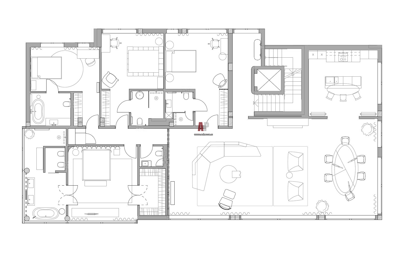 Планировка этажа 2-х этажных апартаментов для отдыха большой семьи.