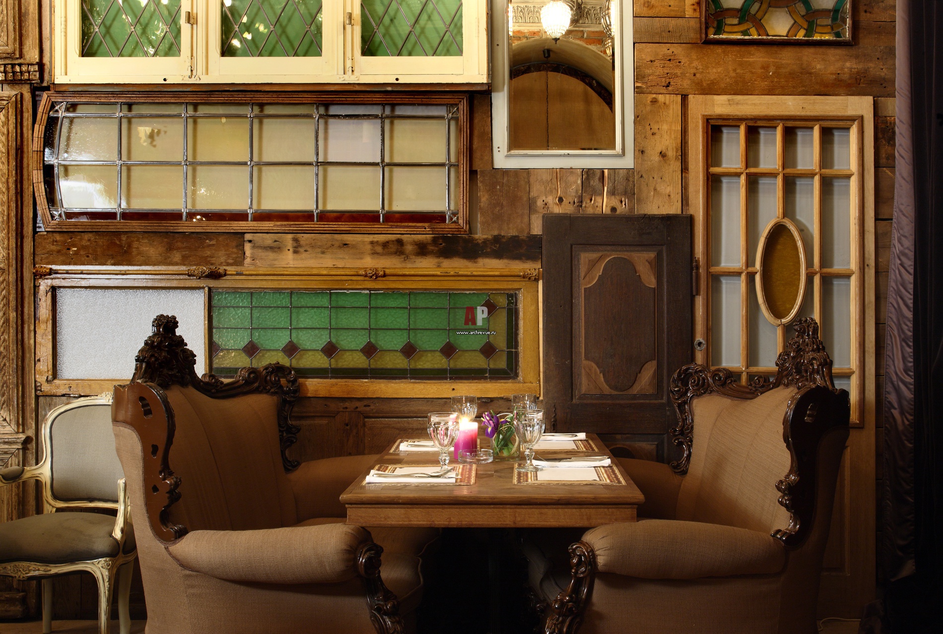 В основном зале с мягкими креслами, стульями и диванами сделана необычная стена из антикварных окон, дверей и витражей, привезенных из Голландии и Бельгии. Одной из них 230 лет.