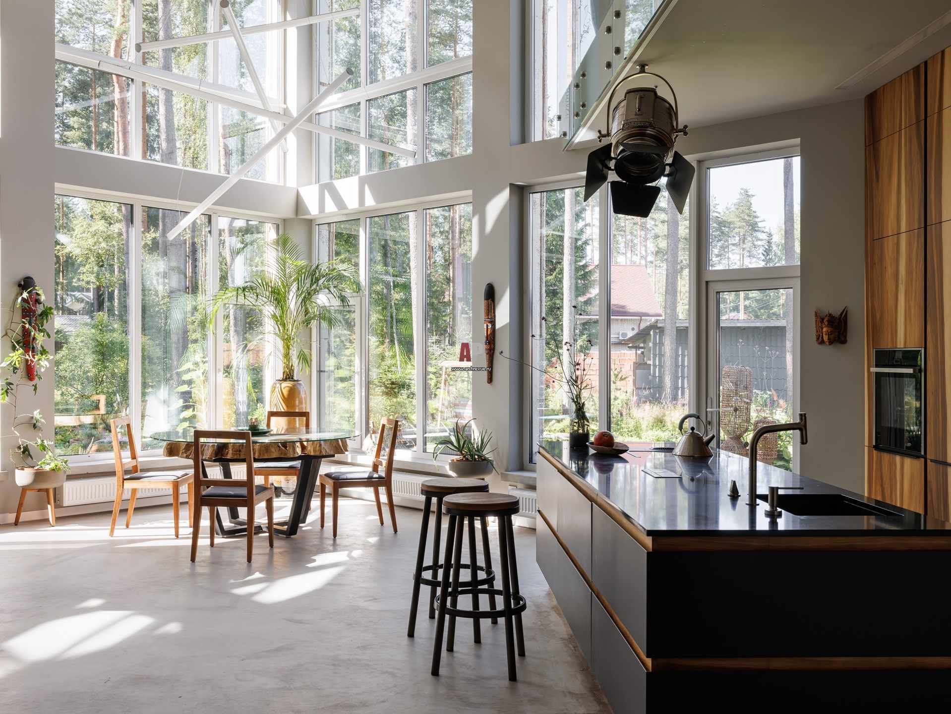 Столовая в угловой части стеклянного эркера. Из нее отрывается вид на весь сад.