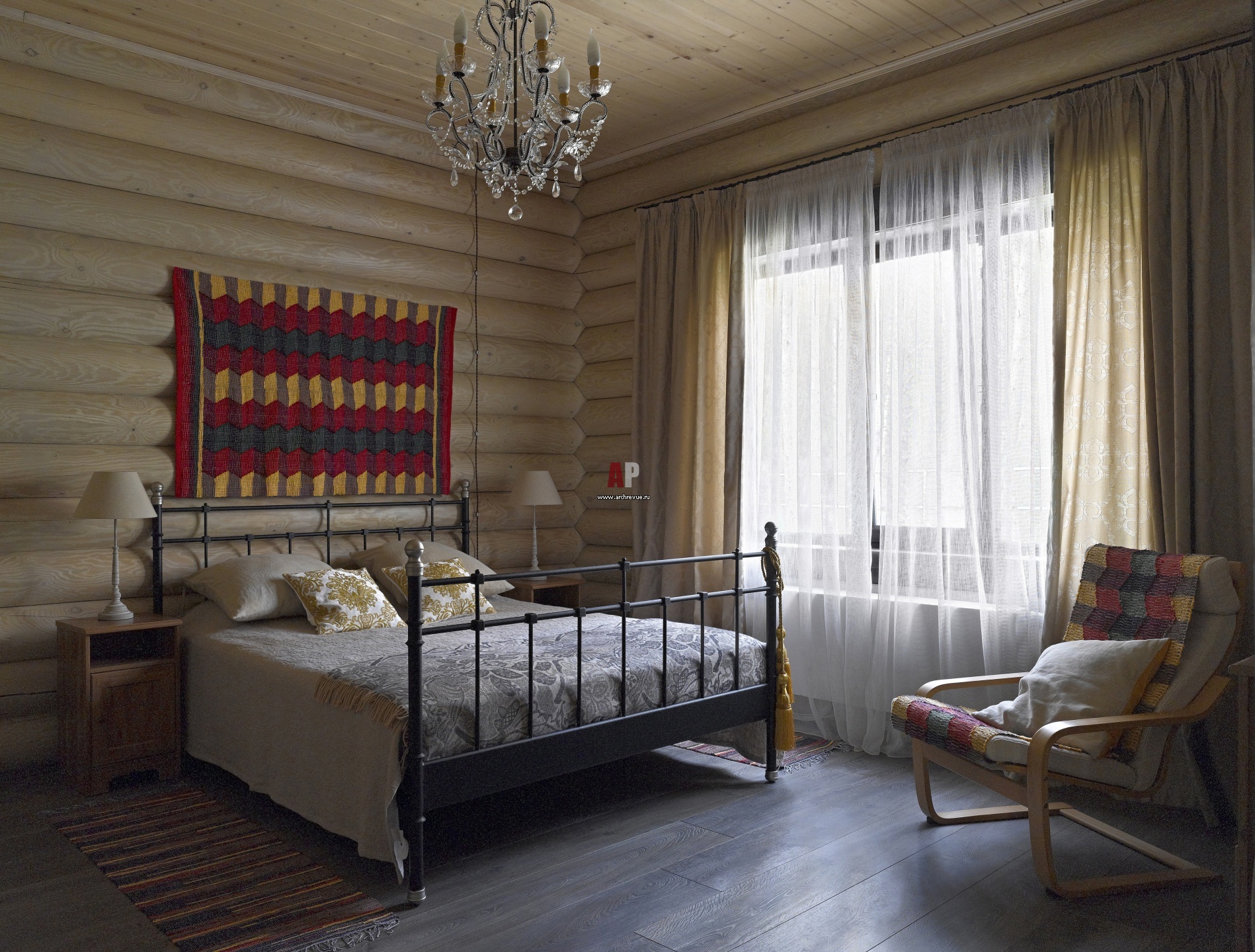 Гостевая на первом этаже с кованой кроватью и элементами кантри.
